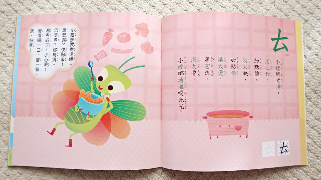 「小螳螂煮湯」的歌詞逗趣,節奏明快,聽過一遍就在腦中揮之不去。讀完這首我還順便教了小寶哥押ㄊ韻的經典繞口令「和尚端湯上塔,塔滑湯落湯燙塔」,寶哥唸到舌頭打結,母子倆笑成一團。