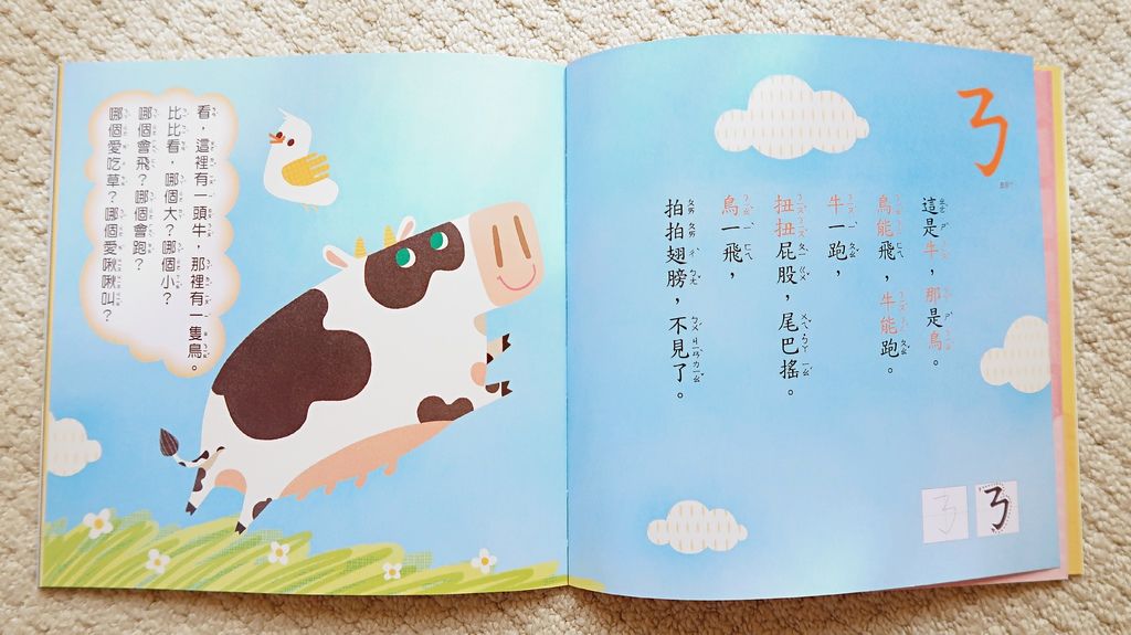 「ㄋ-牛與鳥」唱起來有莫名喜感,插圖中的乳牛也超級可愛。這首歌對小小孩而言也簡單易懂,很適合玩親子唱遊,唱到牛就做出奔跑、扭屁股、搖尾巴的動作,唱到鳥就做出拍拍翅膀飛起來的動作,兄弟倆都很捧場。