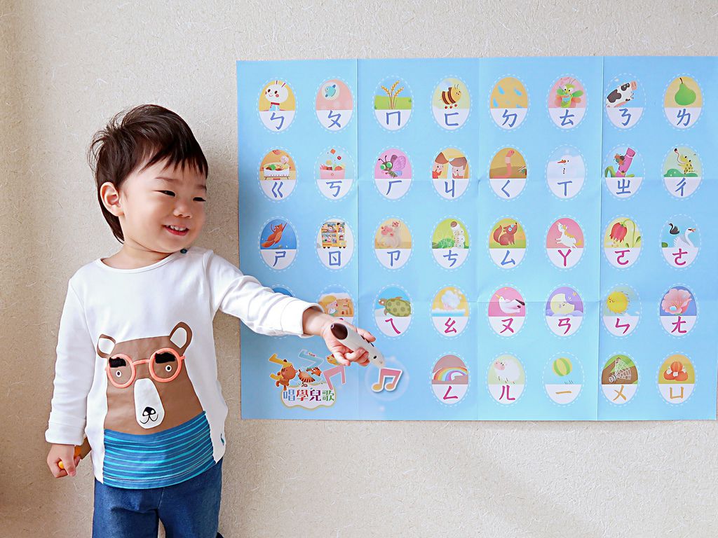 阿梅這個年紀的小小孩特別容易被貼在牆上的點讀大海報吸引,走過路過就會點個幾首來唱唱跳跳,偶爾也會點點注音符號跟著唸,練習幾次後,阿梅的發音竟然比從小只跟媽媽學台灣國語的哥哥標準呢。