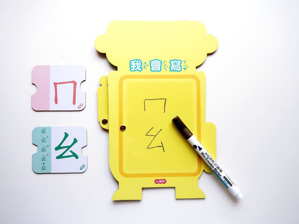 拼音機器人底板翻過來,就變成注音練習字板。套組中附贈一支速乾水擦筆,可以在機器人背後的光面反覆練習寫注音,用濕紙巾或濕布就能輕鬆擦乾淨。