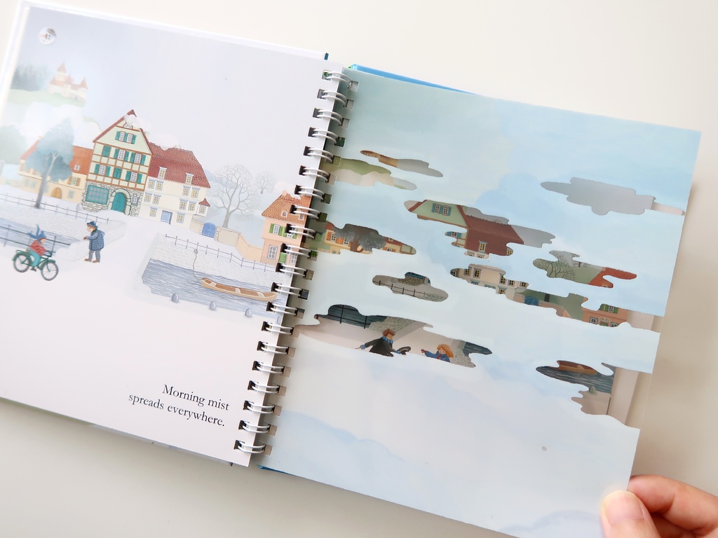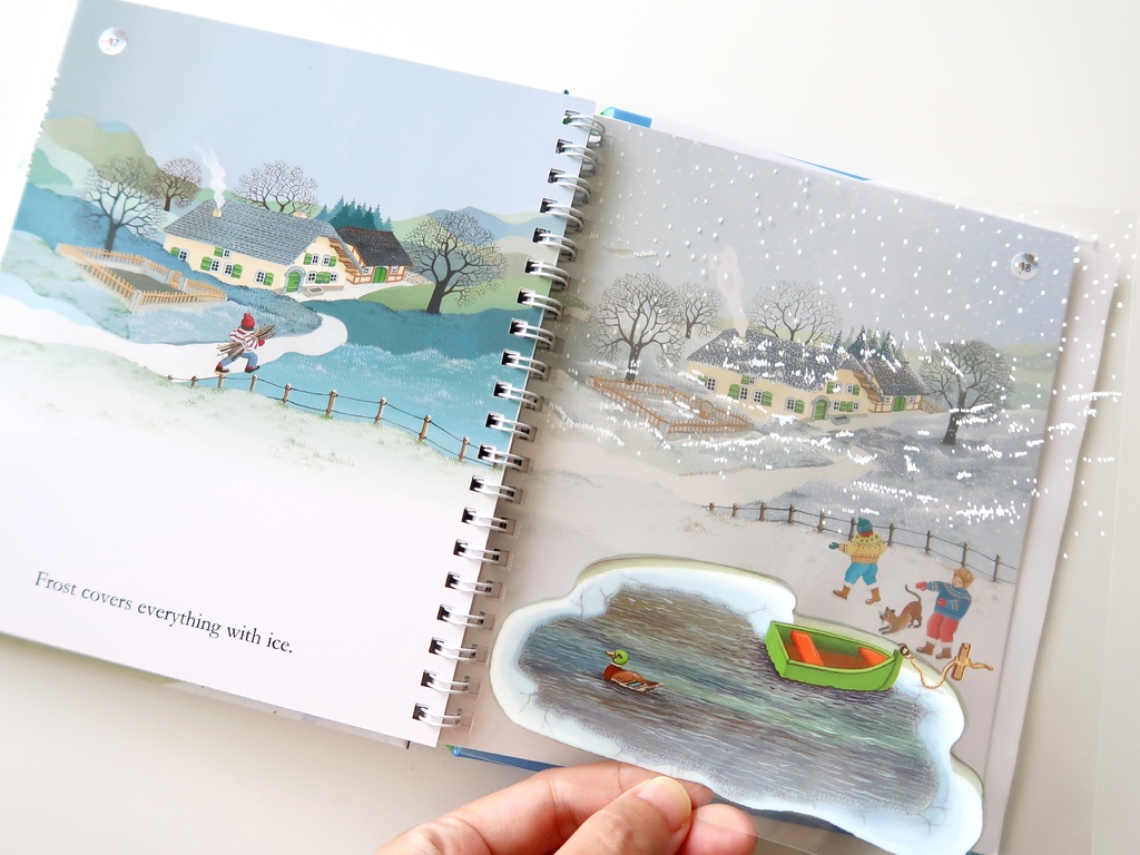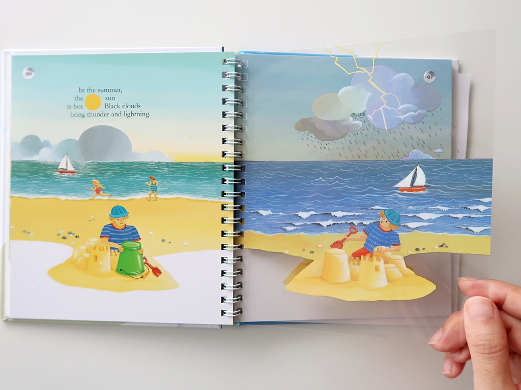 溫暖的春季,大地回春,偶爾會下起小雨。翻開雙面透明膠片,雨朵和小雨就會移動到另一頁。