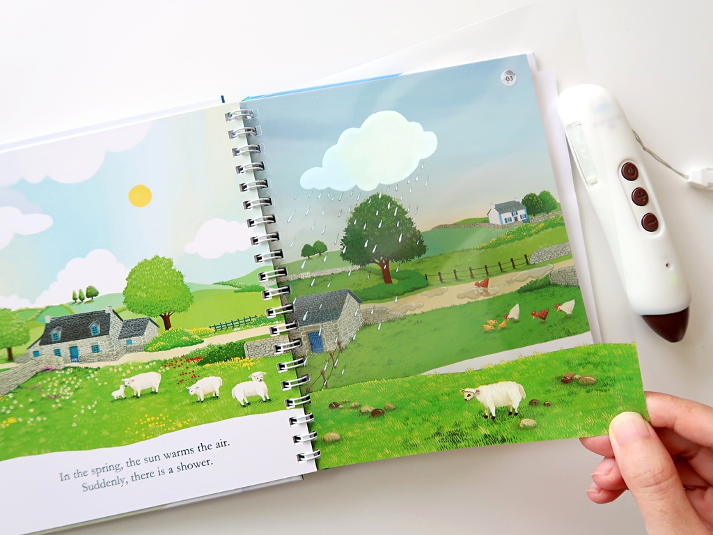 除了英文內文可以用點讀筆朗讀出聲,用點選牧場裡的天空、雲朵、房子、圍籬、樹木、草地、小花、水窪、動物,都會說出各自的英文名稱,不同動物各有逼真的叫聲。