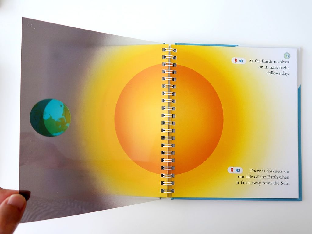 將畫著地球的膠片左翻右翻,就能為孩子演示地球繞著太陽公轉,造成白天和黑夜的原理。(這個設計超天才!)