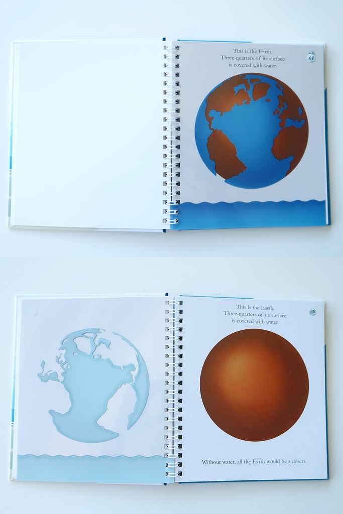 翻開這頁膠片,就能簡單明瞭的向孩子說明地球表面四分之三都是水,如果失去了水,地球就會變成沙漠: