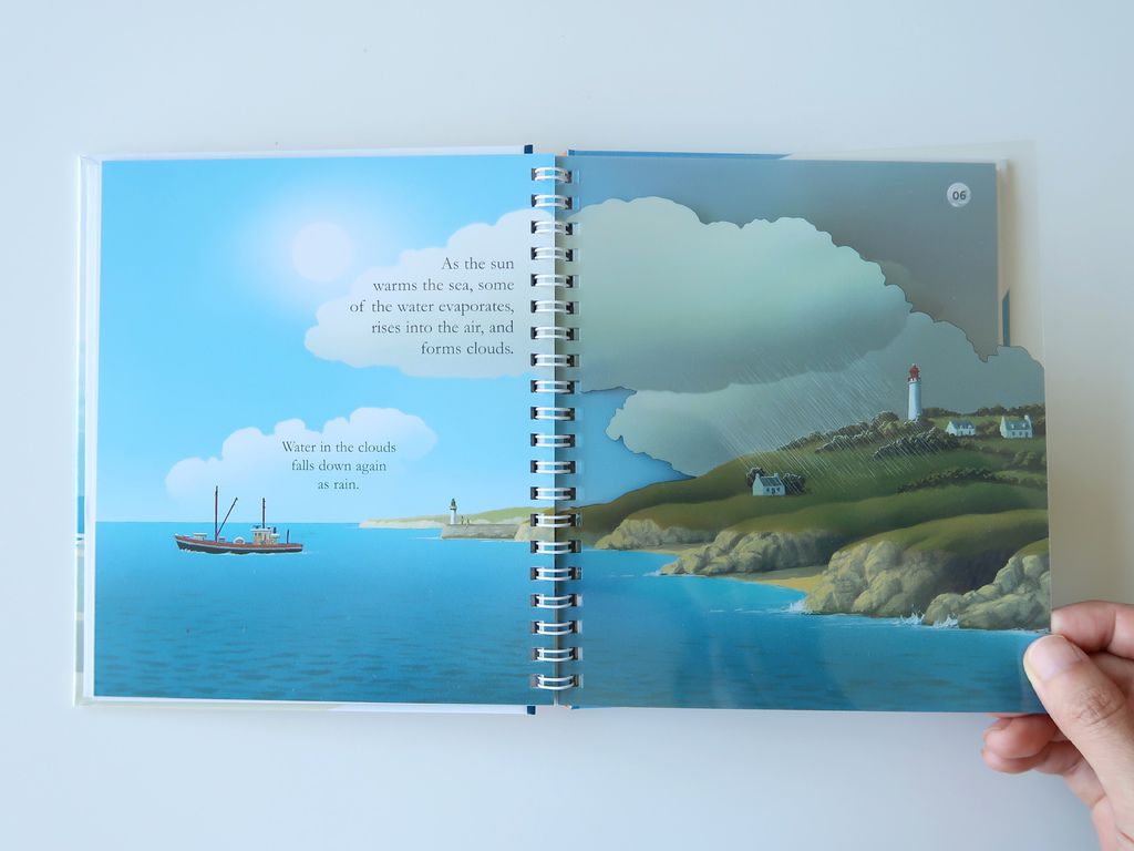 水的三態(固態、液態、氣態)也能透過簡單的圖示表現,膠片翻頁後,下雨的雲層就會變成下雪。