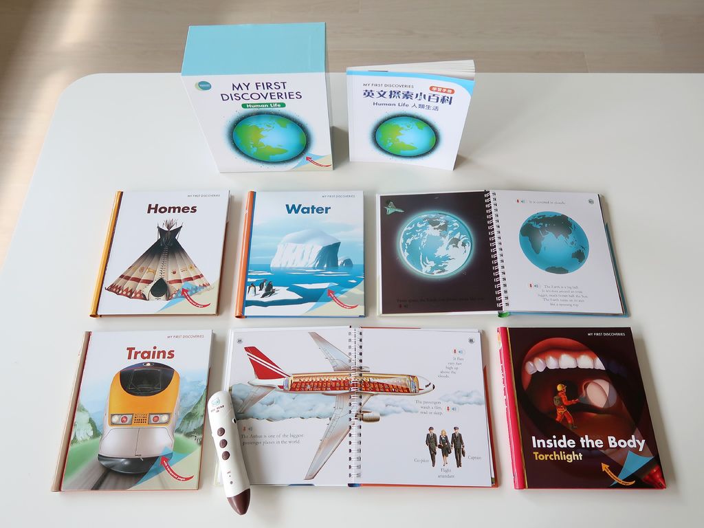 2020年6月出版的My First Discoveries 英文探索小百科第一輯 Human Life 人類生活,內容包括六本主題膠片書、六頁中文情境故事點讀貼紙與錄音點讀貼紙、一本學習手冊、一張隨身點讀小卡。套書不分售。