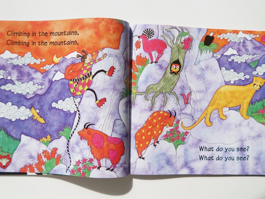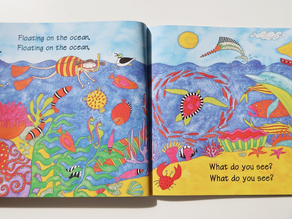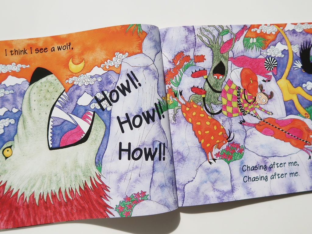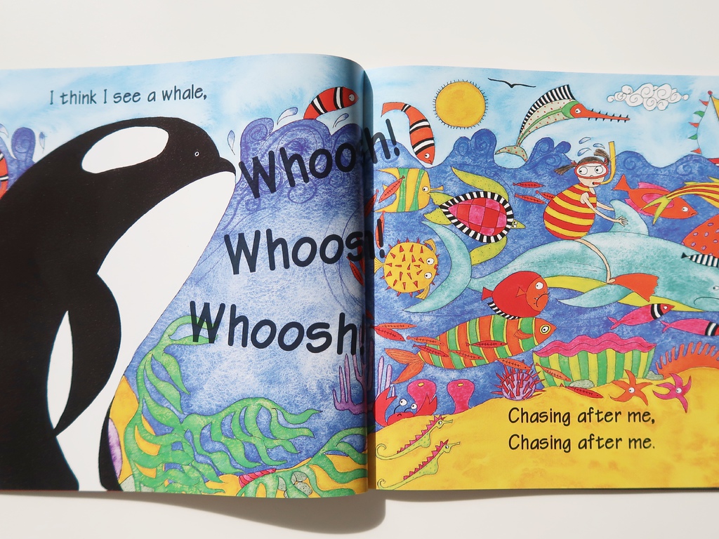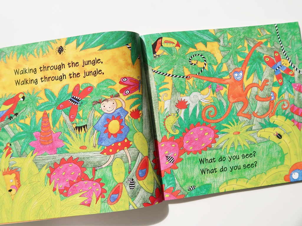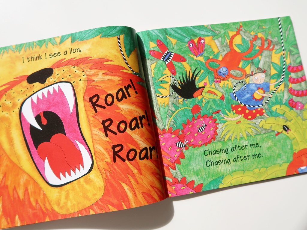 全書不斷重複 Walking through the _____,what do you see? I think I see a _______, chasing after me 的問答句型,以及與動物相關的狀聲詞如獅吼 roar、鯨魚噴水 whoosh、狼嚎 howl、鱷魚猛咬 snap、蛇嘶嘶叫 hiss、熊吼 growl。歌詞旋律都簡單洗腦,孩子聽幾遍就能跟著好聽的旋律順口唱或唸出來。