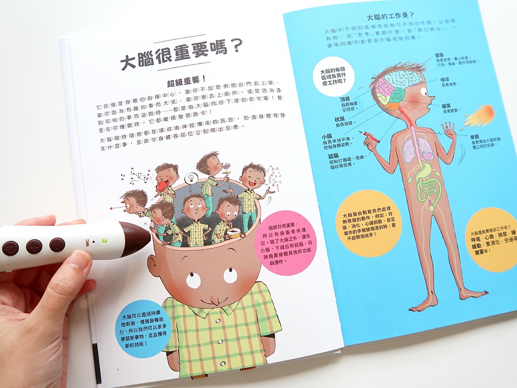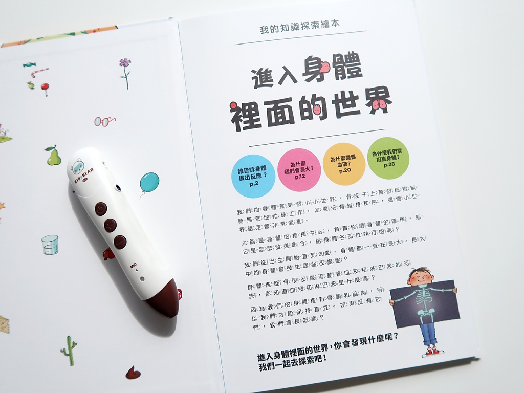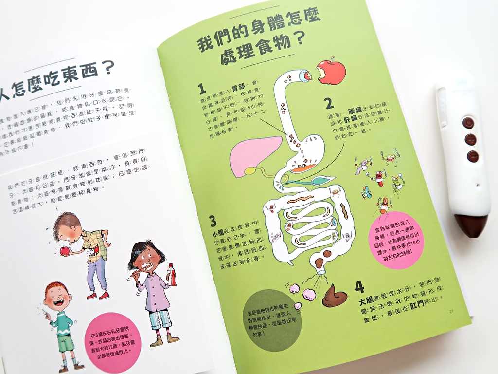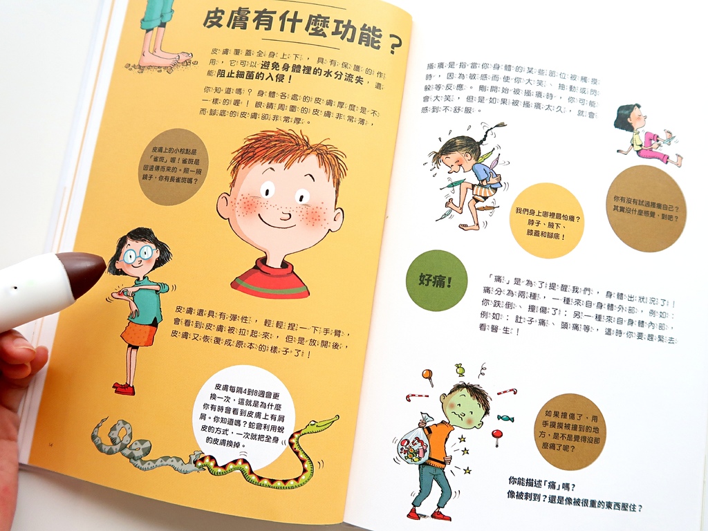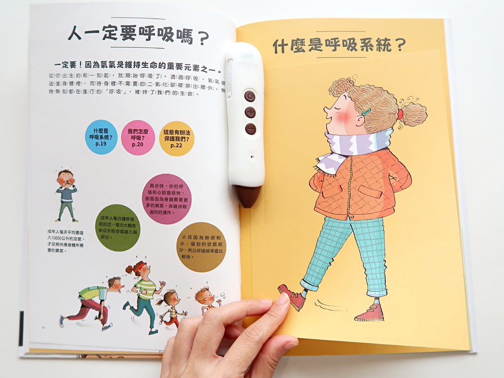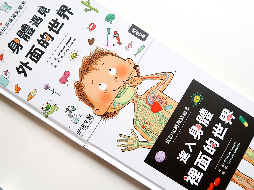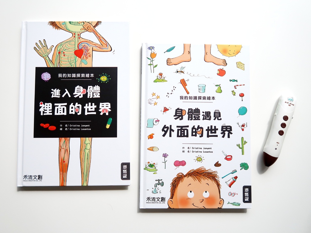 兩本中文點讀繪本《進入身體裡面的世界》與《當身體遇見外面的世界》,透過Q&A問答的方式,來了解人體如何運作,例如「為什麼我們會長大」、「人為什麼會尿尿?」、「為什麼沒有骨頭,我們就會像一團肉?」「為什麼人會打噴嚏、咳嗽、打嗝?」
