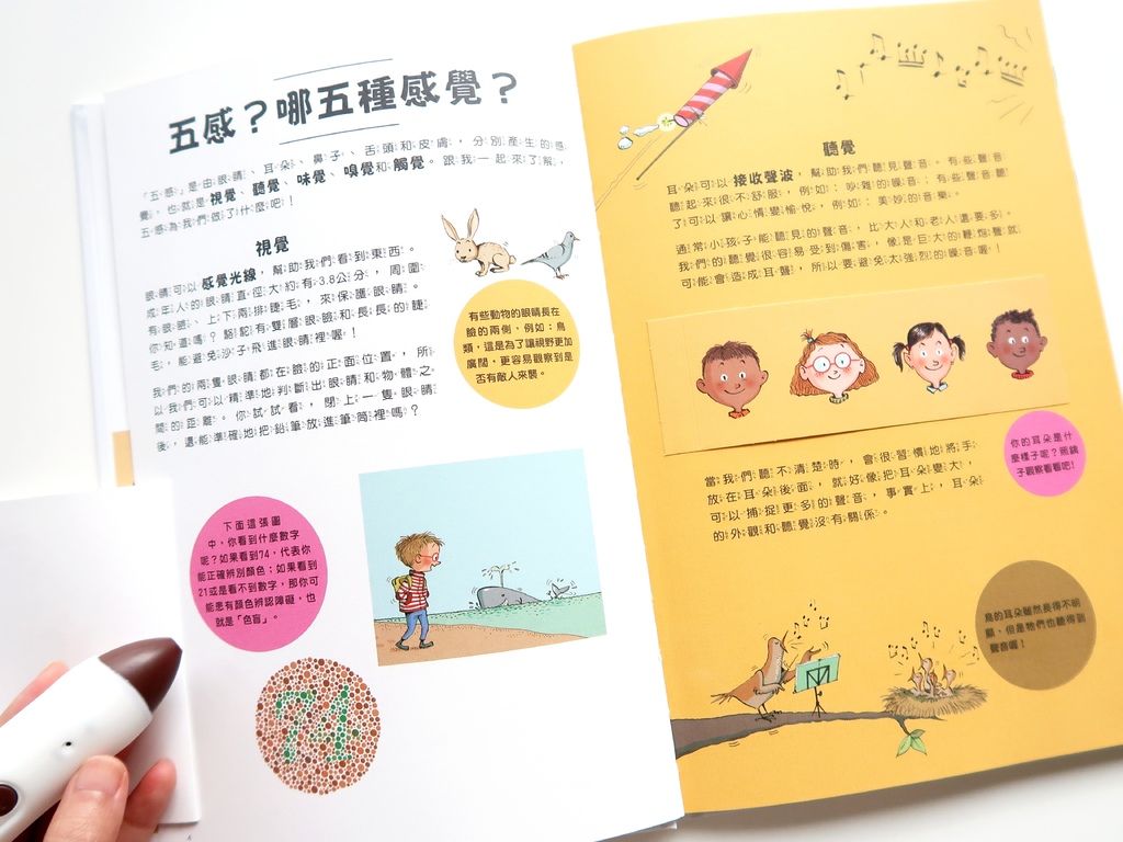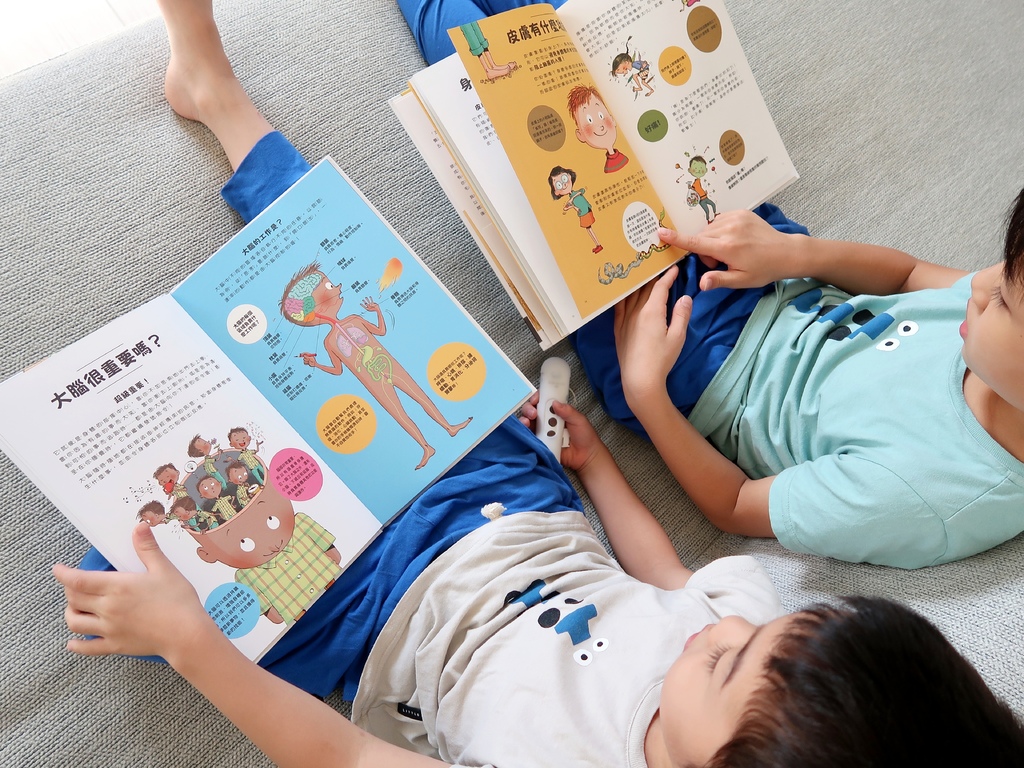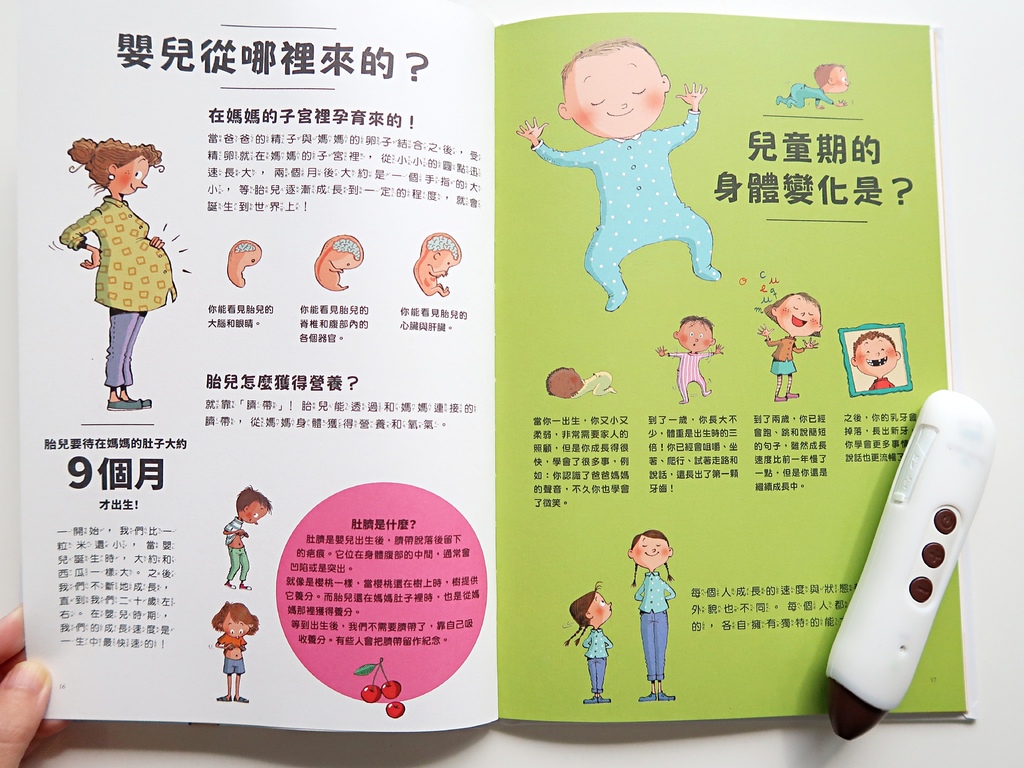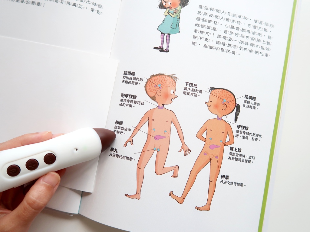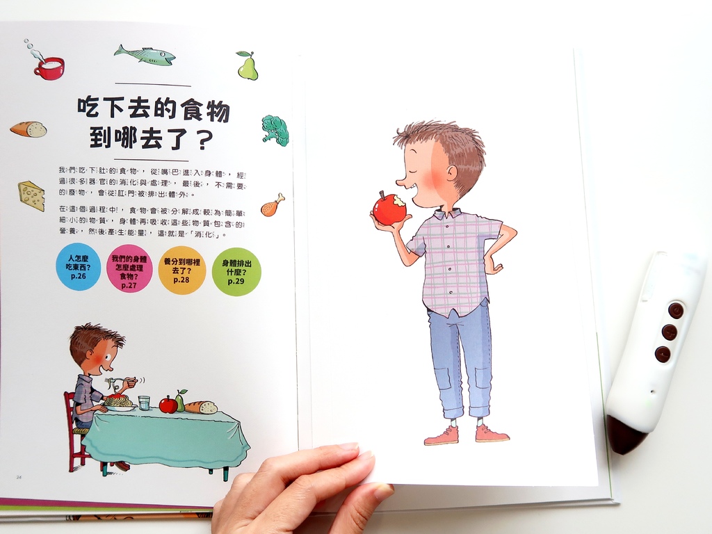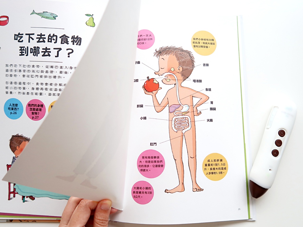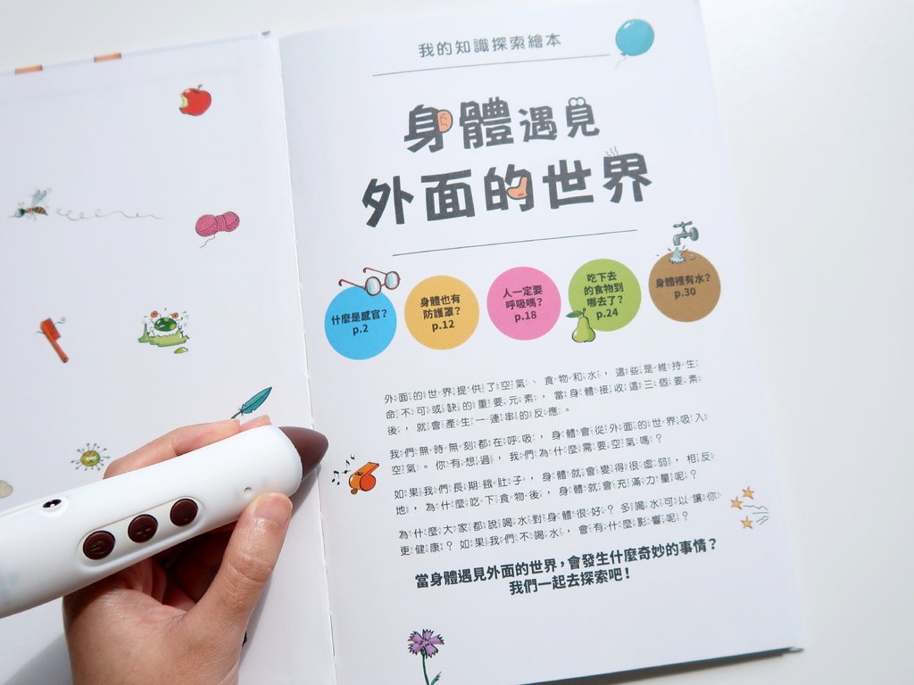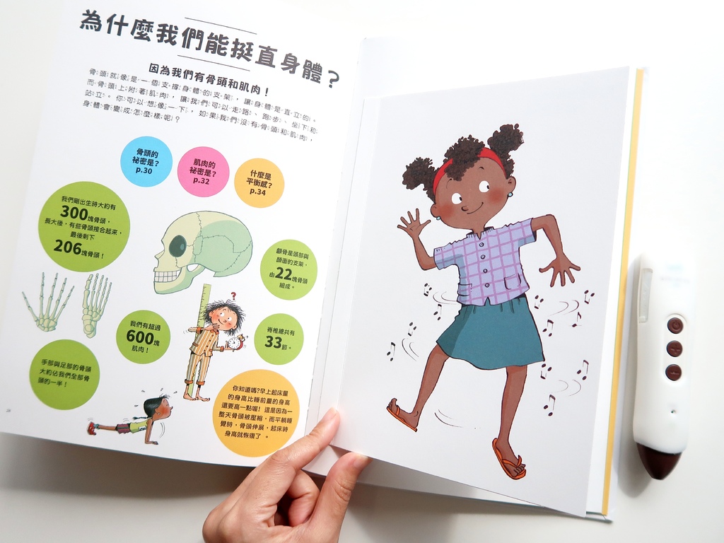 兩本中文點讀繪本《進入身體裡面的世界》與《當身體遇見外面的世界》,透過Q&A問答的方式,來了解人體如何運作,例如「為什麼我們會長大」、「人為什麼會尿尿?」、「為什麼沒有骨頭,我們就會像一團肉?」「為什麼人會打噴嚏、咳嗽、打嗝?」