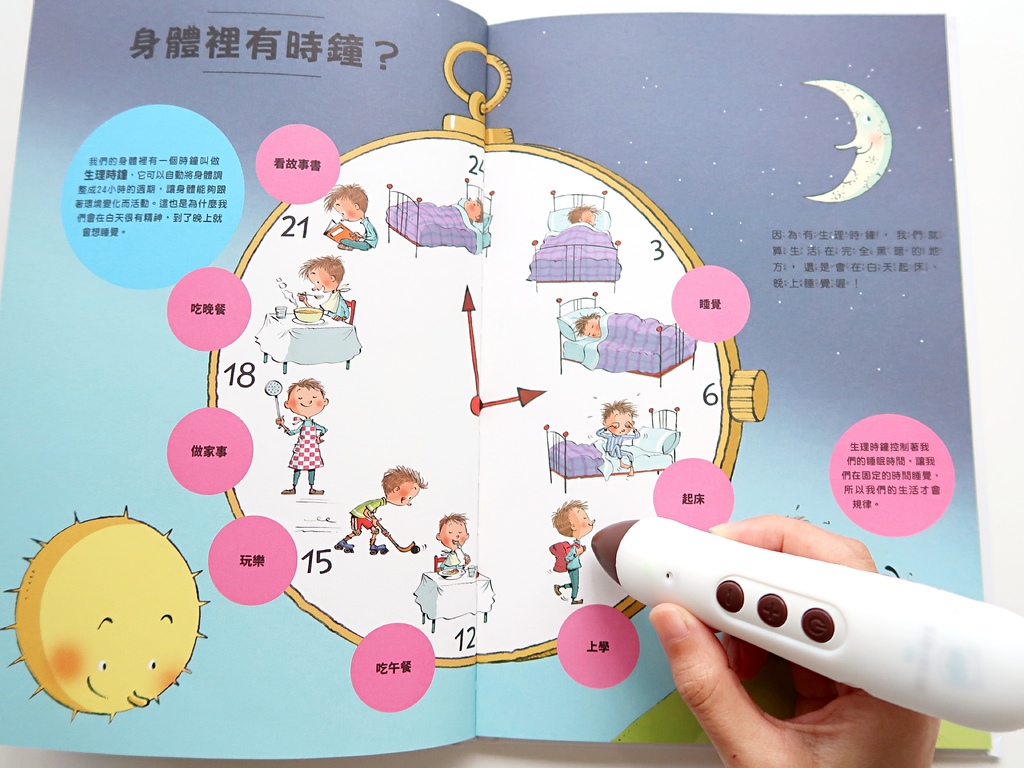 介紹生理時鐘時,點選時鐘上從事各種活動的小男孩,都能聽到生動的情境對白或音效,讓小讀者身歷其境。連旁邊的太陽月亮也有隱藏版台詞喔!