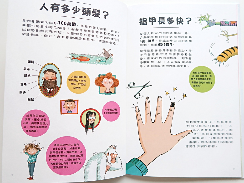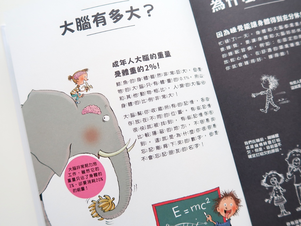 這套繪本透過Q&A問答的方式,來了解人體如何運作,例如「大腦很重要嗎?」、「我們為什麼需要血液」、「吃下去的食物到哪裡去了?」、「人為什麼會尿尿?」
