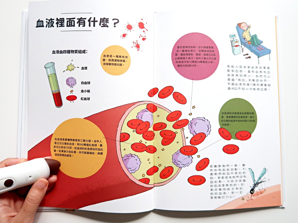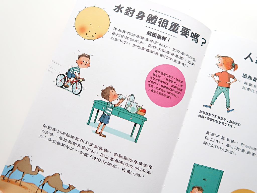 國小三年級的寶哥可以獨立閱讀,把這套書當成人體知識小百科,有空就讀幾頁,興致來了還會主動跟媽媽分享一些新學到的小知識:「人如果完全不喝水,最多只能活5天,但駱駝可以一口氣喝下90公升的水存在身體裡,然後8天都不用喝水!」「妳知道人身上的血管長度超過十萬公里,可以繞地球2.5圈嗎?」「每分鐘最多可以打嗝12次,據說有人連續打嗝了57年!」
