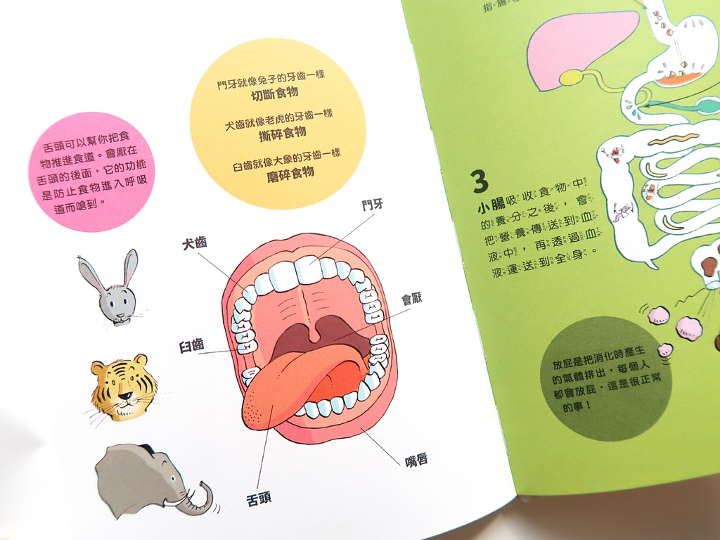 「在人怎麼吃東西?」這頁中,放大特寫口腔,再以幼兒熟悉的野生動物為例,介紹不同種類功能的牙齒:「門牙就像兔子的食物,切斷食物;犬齒就像老虎的牙齒,撕碎食物;臼齒就像大象的食物,磨碎食物。」是不是讓人印象更深刻?