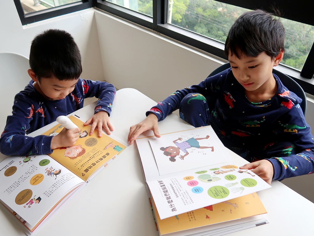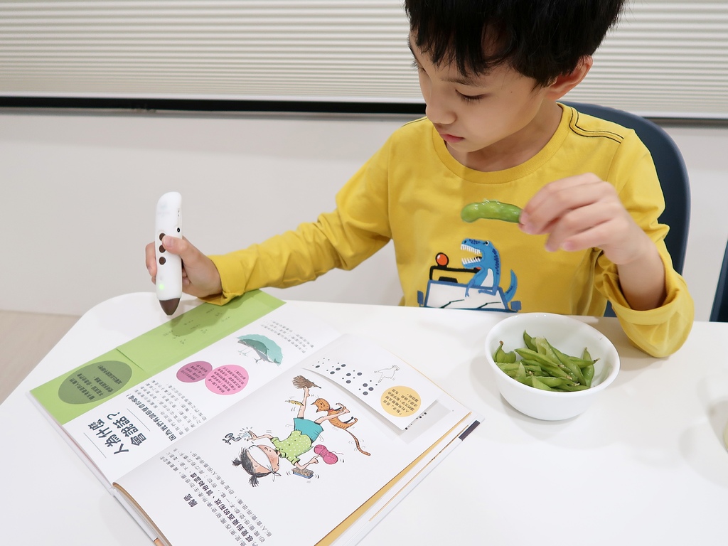 我們家幼兒園大班的弟弟阿梅,除了和媽媽一起輕鬆親子共讀,最喜歡用點讀筆點內文來聽,被插圖的幽默對白或音效逗樂。