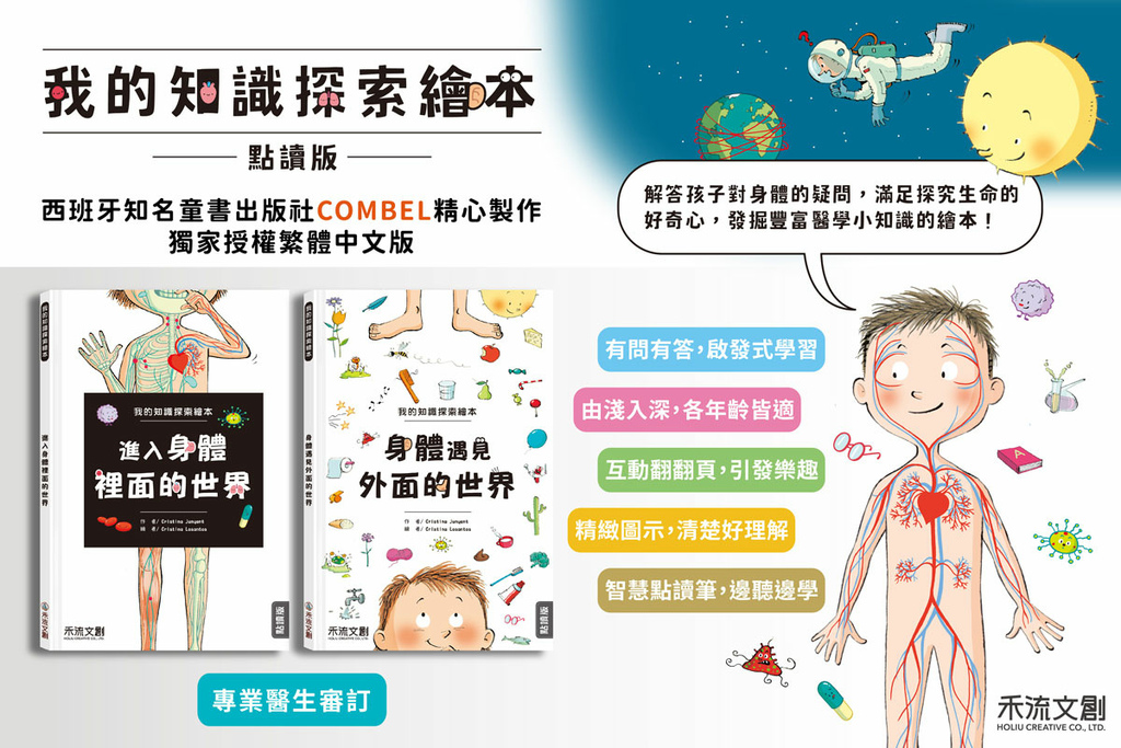 「我的知識探索繪本」是禾流文創取得西班牙知名童書出版社 Combel 獨家授權,專為孩童精心製作的人體知識科普繪本套書,從「身體就是一個小小世界」切入主題,邀請孩子跟自己的身體當好朋友,解答關於人體的各種疑問。