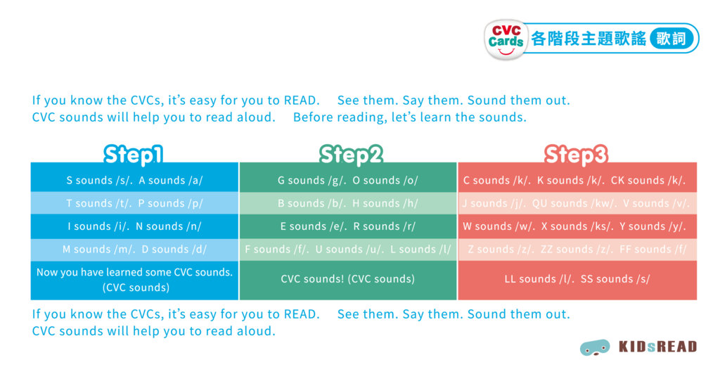 這些主題音素的發音,除了融入30本讀本故事中,也被編寫進 CVC Cards 的主題歌謠,旋律活潑輕快,多聽幾遍就琅琅上口。