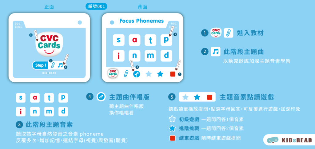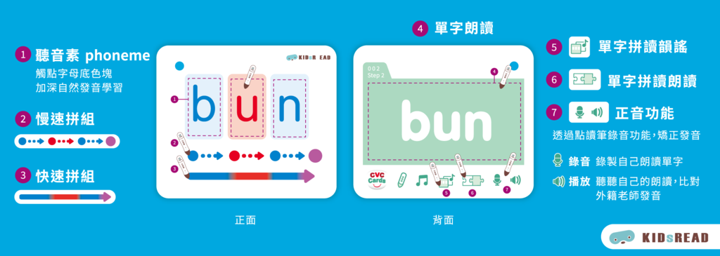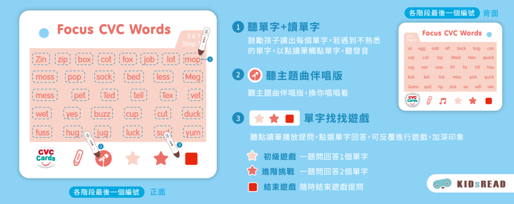 除了為讀本和練習本加入各種實用的點讀功能,KidsRead 也貼心設計了搭配讀本內容的 CVC Cards 自然發音拼讀卡,獨特的點讀拼讀功能,可單獨練習或搭配讀本使用,讓孩子學習自然發音拼讀更有效率。