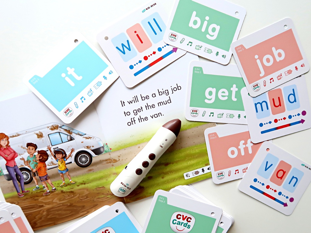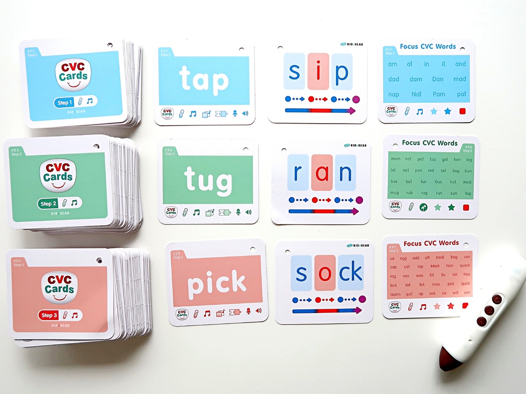 KidsRead 建議家長可以與孩子先使用 CVC Cards 自然發音字卡,對 CVC Words 累積一定的熟悉度後,再來閱讀故事讀本、使用練習本,閱讀會更有效率和成就感。