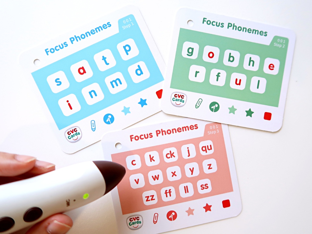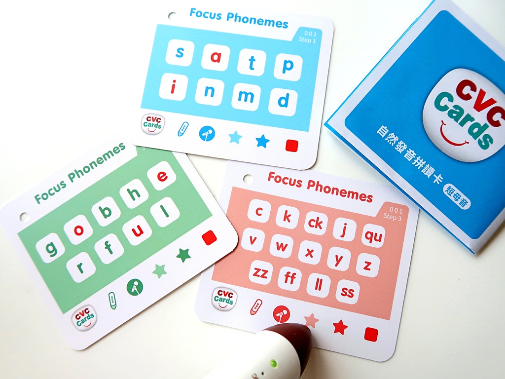 CVC Cards 共有150張點讀卡片,每個階段都有一張主卡、數十張單字拼讀卡、一張單字總卡。