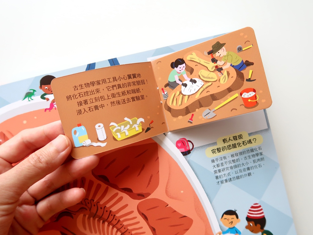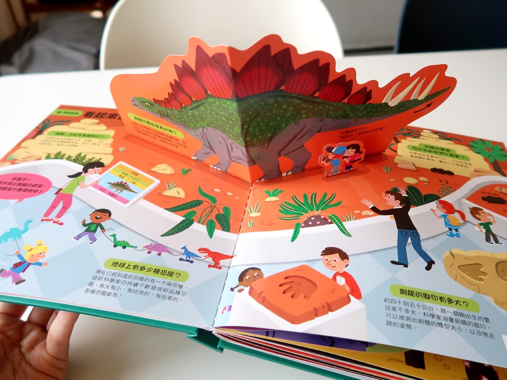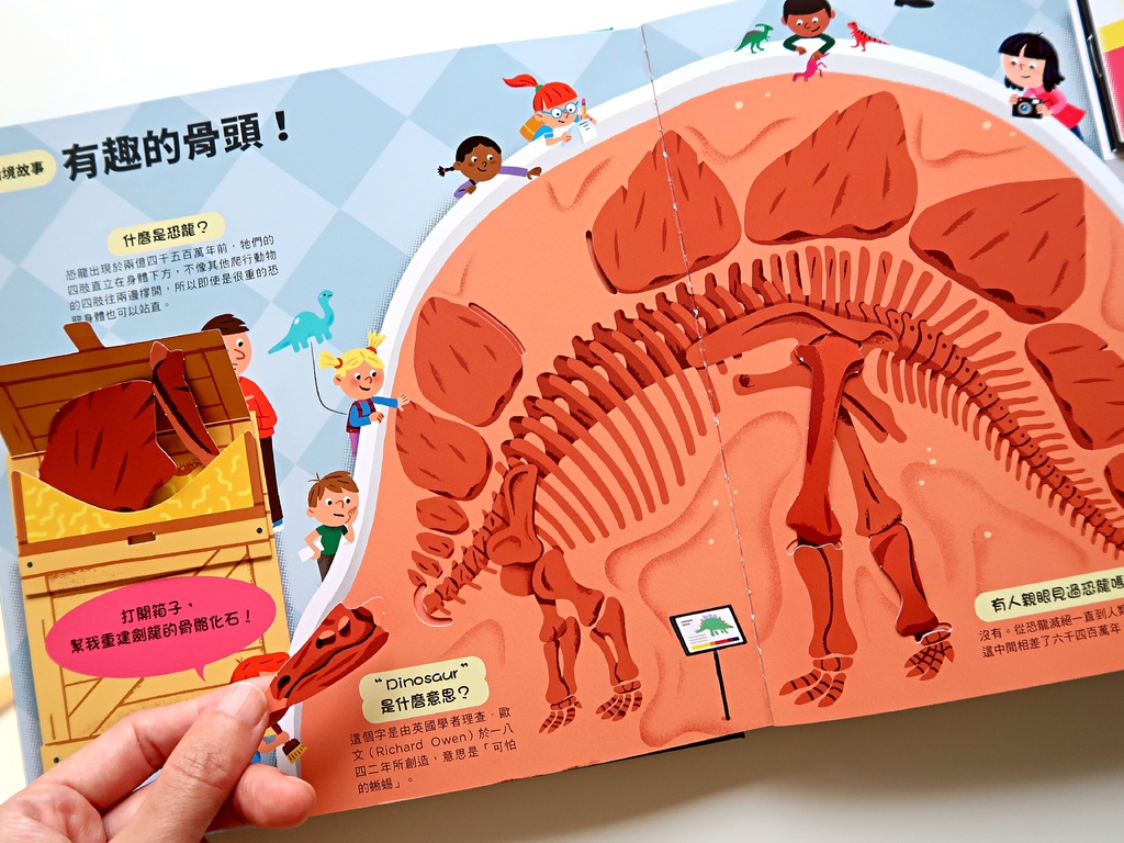 目前為止被發現的恐龍化石幾乎都是不完整的,古生物學家需要靠著長期研究重建恐龍的外觀。打開書頁上的箱子,裡面有五塊劍龍骨骼,書頁上的劍龍骨骼模型缺了好幾塊,小讀者可以動手幫忙重建劍龍的骨骼化石喔!