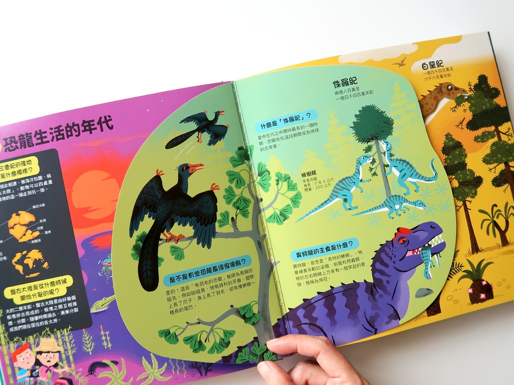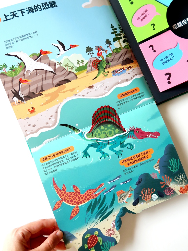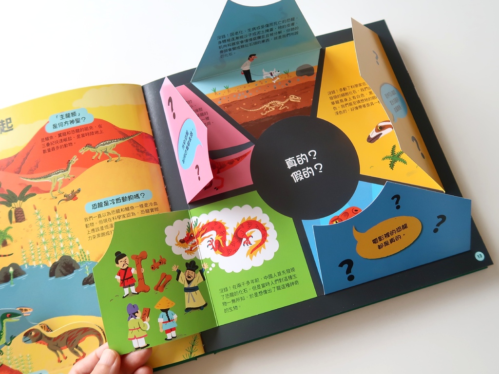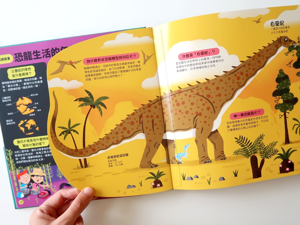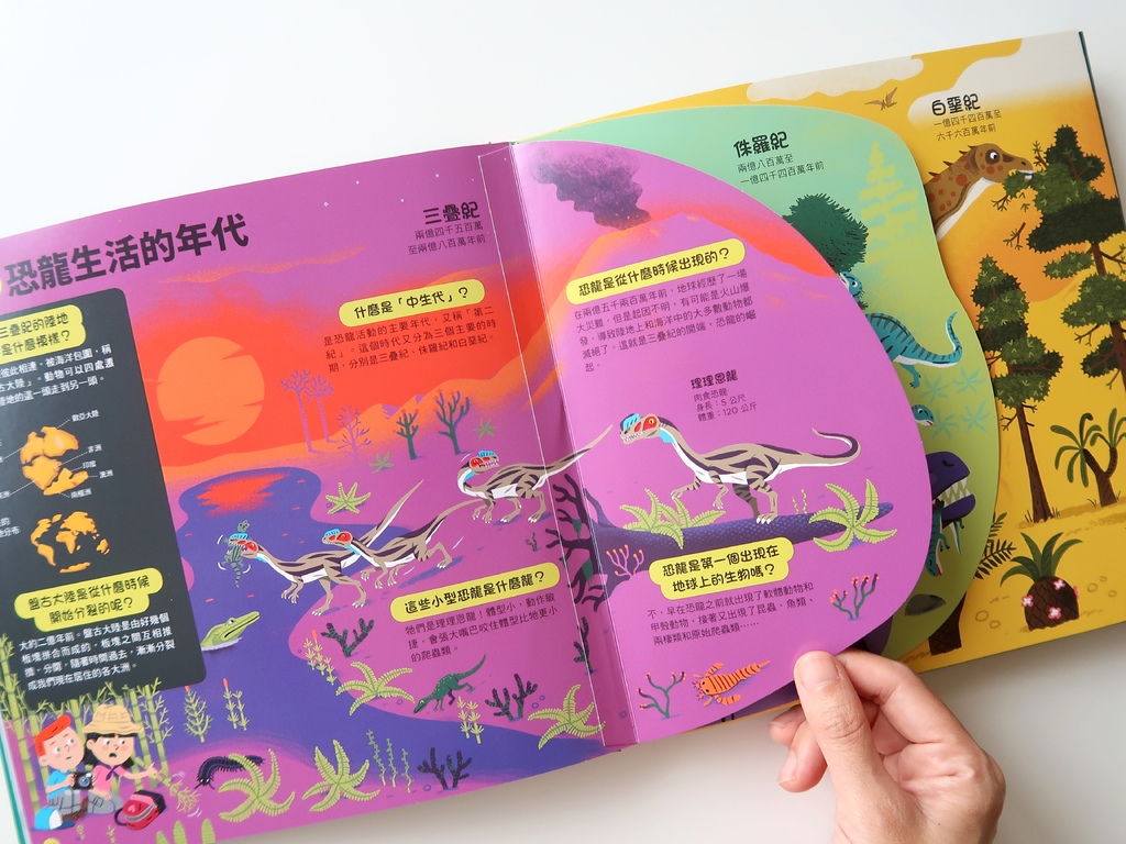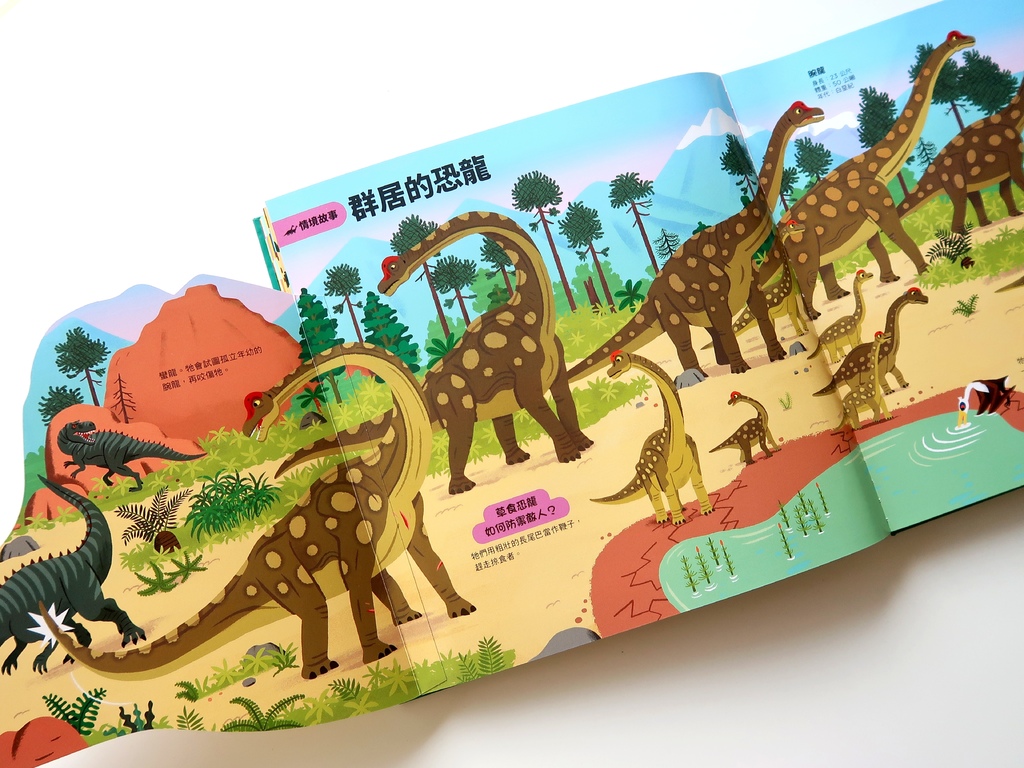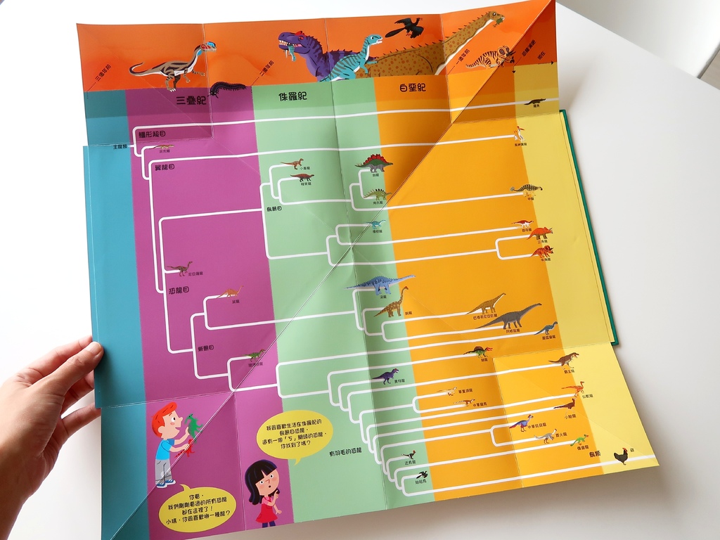 《發現恐龍世界》的最後一頁是個立體大摺頁,掀開後可以看到恐龍分類年份代表,上面的文字也都有點閱讀功能。找找看你最喜歡的龍生活在哪個時代,又屬於哪一類哪一目吧?……閱讀更多