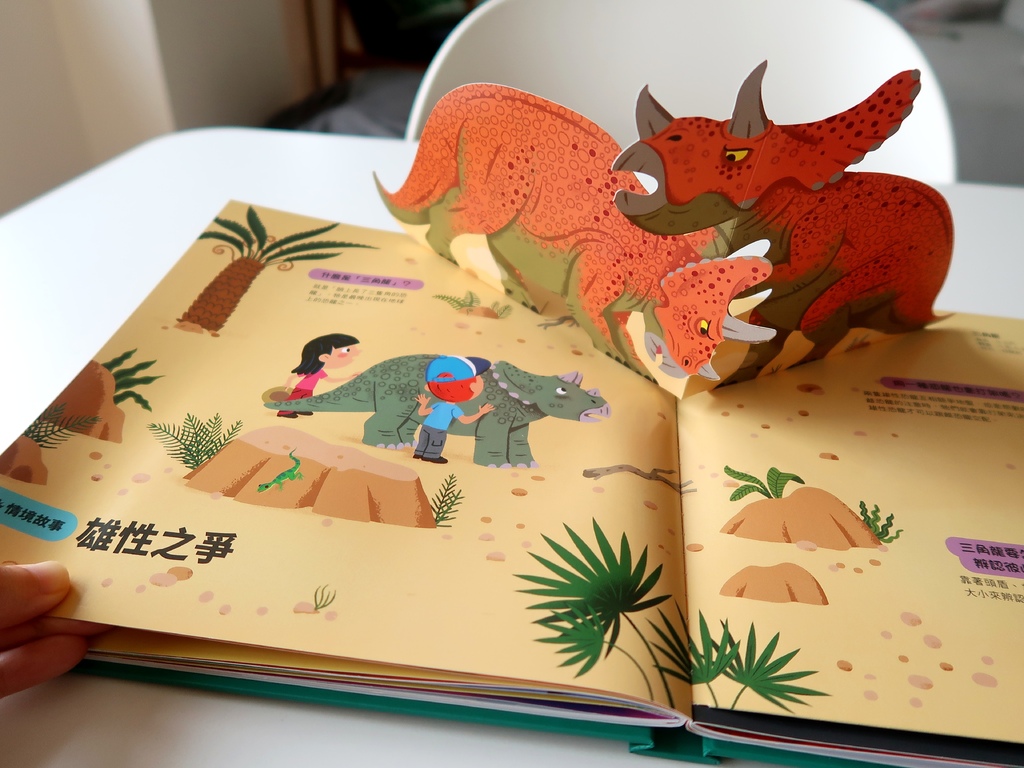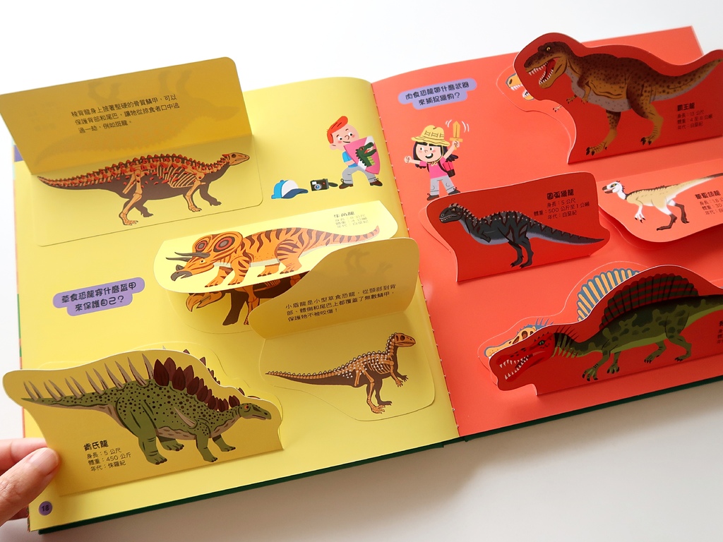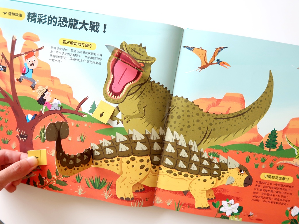 拉動書頁上的機關,霸王龍就會張開血盆大口露出利齒,甲龍則會左右甩動尾巴防禦!這場恐龍大戰,究竟誰會勝出呢?