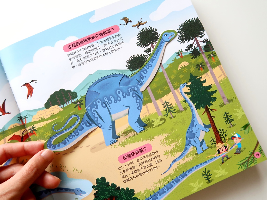 巨大的梁龍是草食動物,以花朵和果實為主食,有八十塊脊椎骨讓牠支撐長長的脖子和尾巴。用手輕輕拉動書頁上梁龍的尾巴,梁龍的頭就能吃到大樹上的葉子啦。