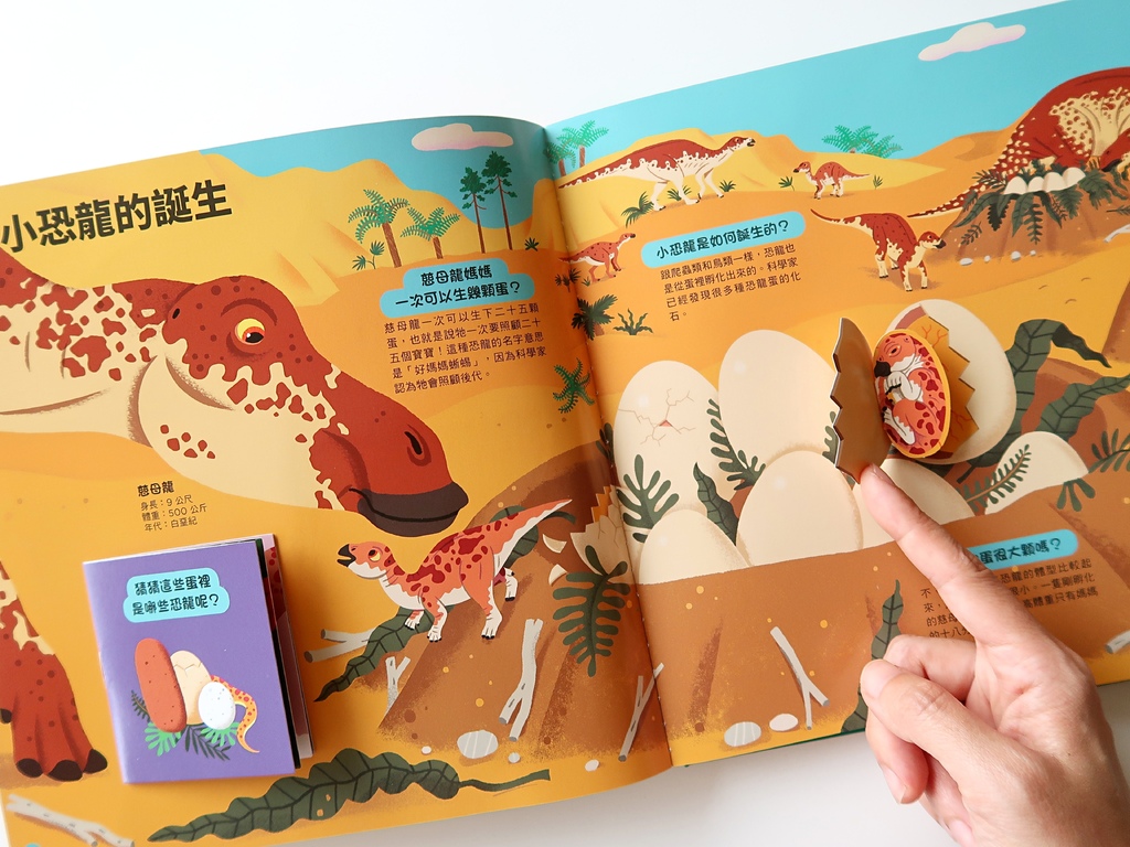 和成年恐龍比較起來,恐龍的蛋其實很小,剛孵化出來的慈母龍寶寶,身高體重只有媽媽的十八分之一。掀開小翻頁,偷看一下恐龍蛋裡的恐龍寶寶吧!