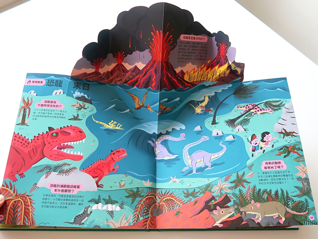 恐龍是怎麼消失的?這個大跨頁用立體的火山爆發場景,讓小讀者更身歷其境。