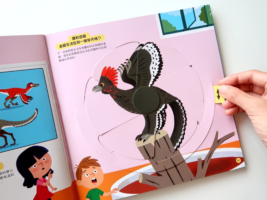 科學家現在證實,鳥類不只是從恐龍演化而來,而是根本就是恐龍!現在的鳥類是從生活在恐龍時代的鳥類演化而來。轉動書頁上的大轉盤機關,公雞就會搖身一變變成「近鳥龍」。