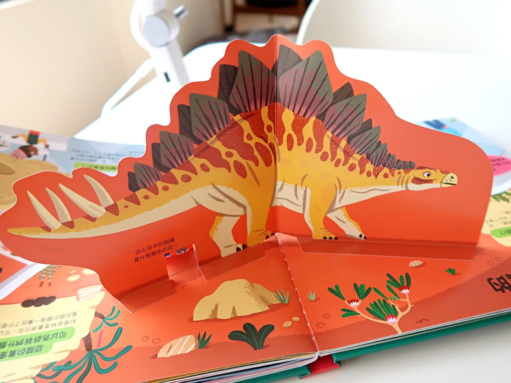 把書轉個方向,就會在立體機關的反面看到另一種顏色的劍龍喔!你心目中的劍龍是什麼顏色的呢?