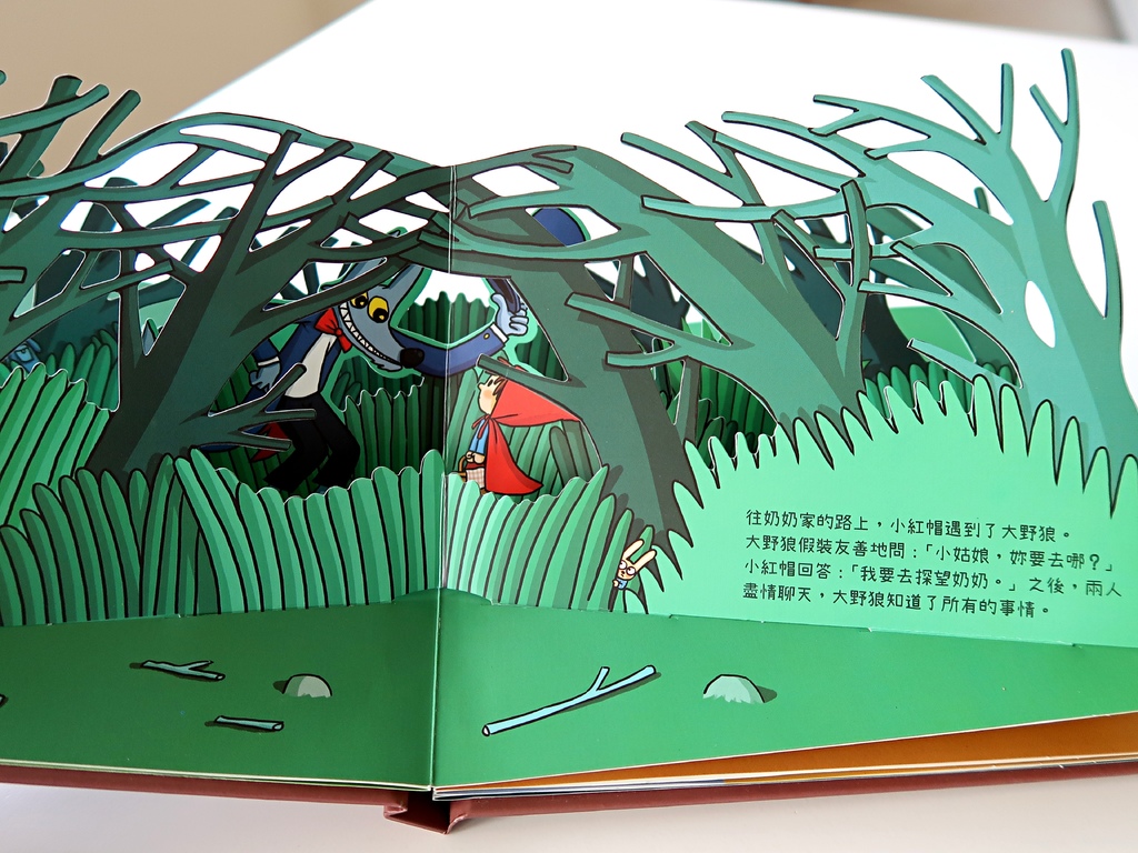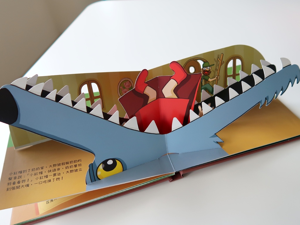大野狼吞掉小紅帽的情境跨頁,一打開就是野狼的尖牙利齒血盆大口,和只剩下半身露在狼口外的小紅帽。
