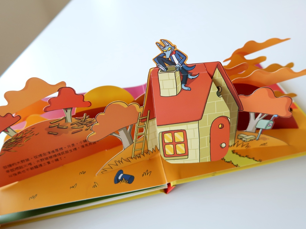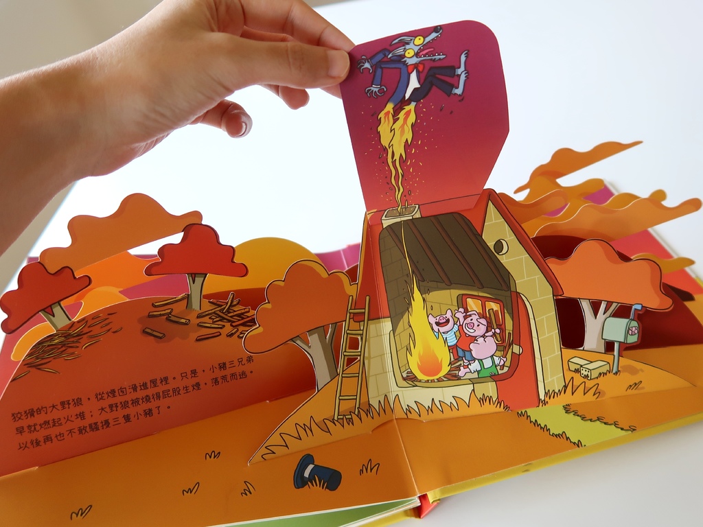 上掀翻頁,爬進豬小弟家煙囪的大野狼就會被火堆燒得屁股生煙,落荒而逃: