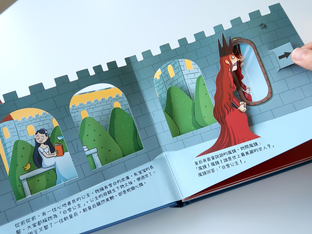 例如向右抽拉機關,魔鏡中皇后的倒影就會變成白雪公主: