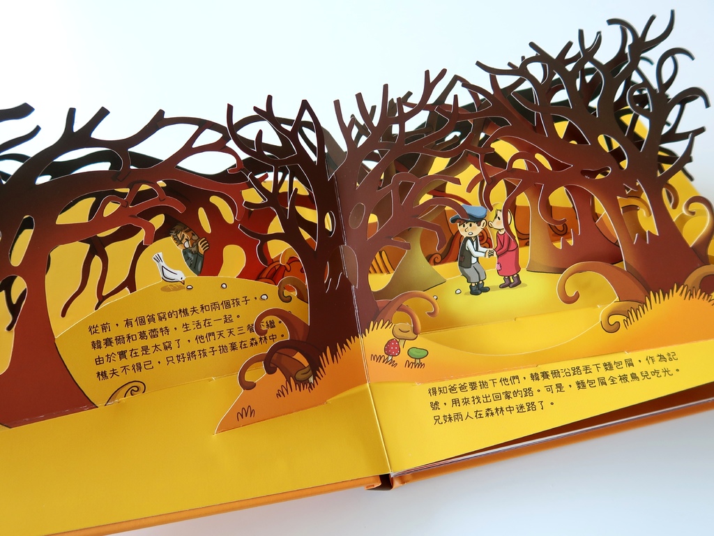 《糖果屋》中苦情兩兄妹迷路的蒼涼棕色森林,乾枯樹枝詭異扭曲,有如邪惡巫婆的手指。不得已拋棄孩子的樵夫,則躲在樹後黯然神傷。