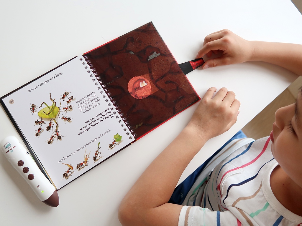 每本書都有獨特的雙面膠片工藝設計,以精緻手繪插圖呈現科普知識,吸引孩子互動。其中Insects 昆蟲,還搭配紙製的「神奇手電筒」,搭配深色膠片使用,就能變身童書界近年最流行的「手電筒膠片書」。