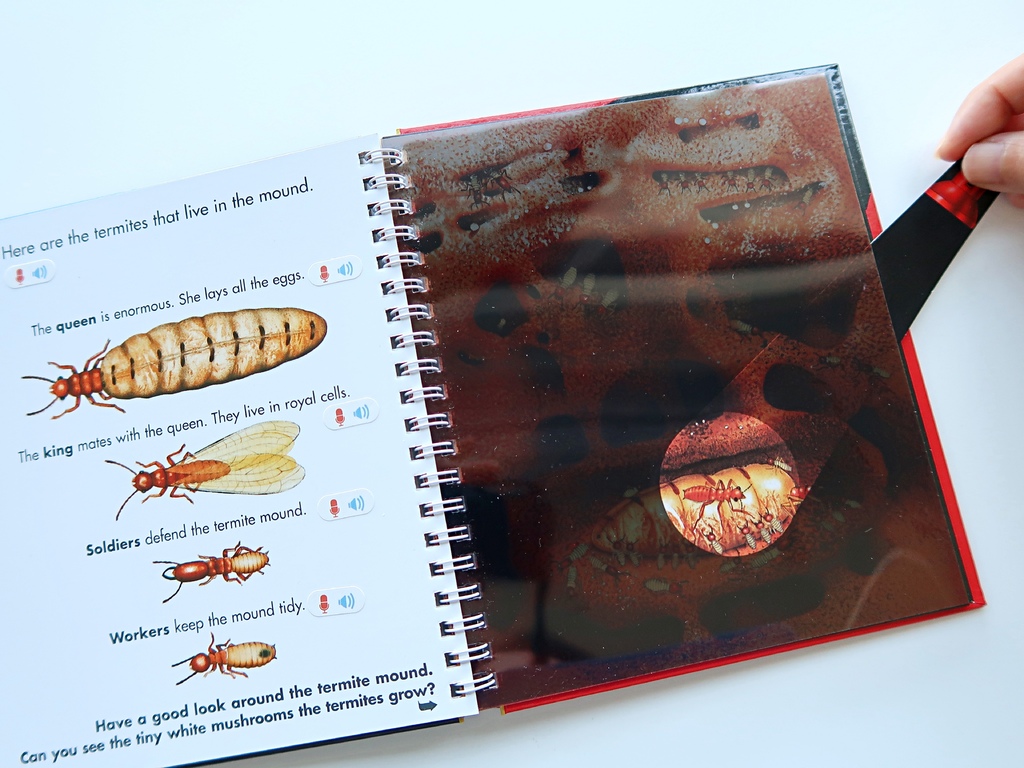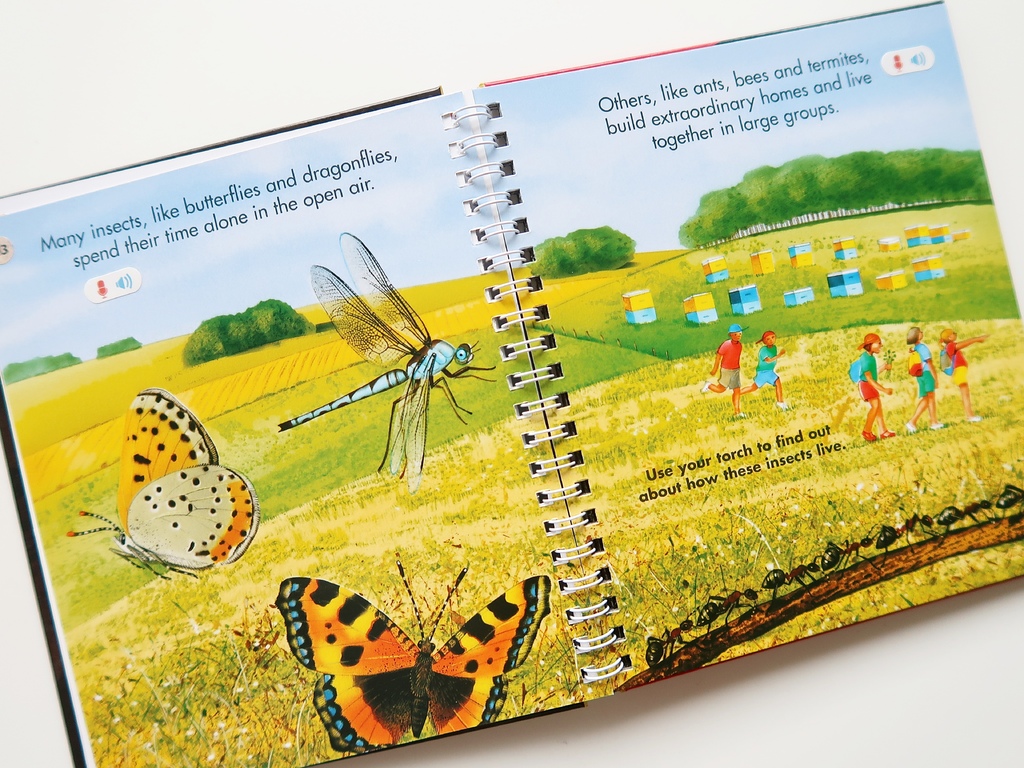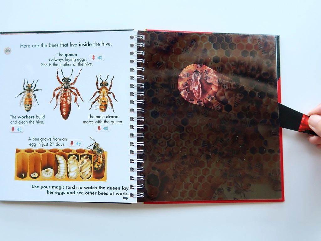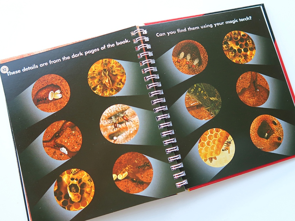 這一本的「Insects 昆蟲」則是介紹螞蟻、蜜蜂和白蟻這幾種會建造奇特巢穴的群居類昆蟲,介紹昆蟲在群體中所扮演的不同角色和地位。阿梅都說這本是「蟲蟲的家」,將書中附的紙製手電筒放在深色膠片下,可以一窺蟲蟲家的秘密,看看他們都在家裡做什麼。