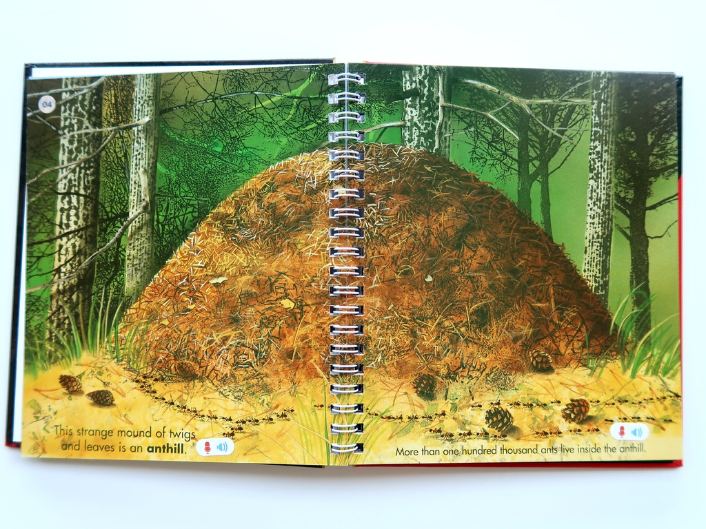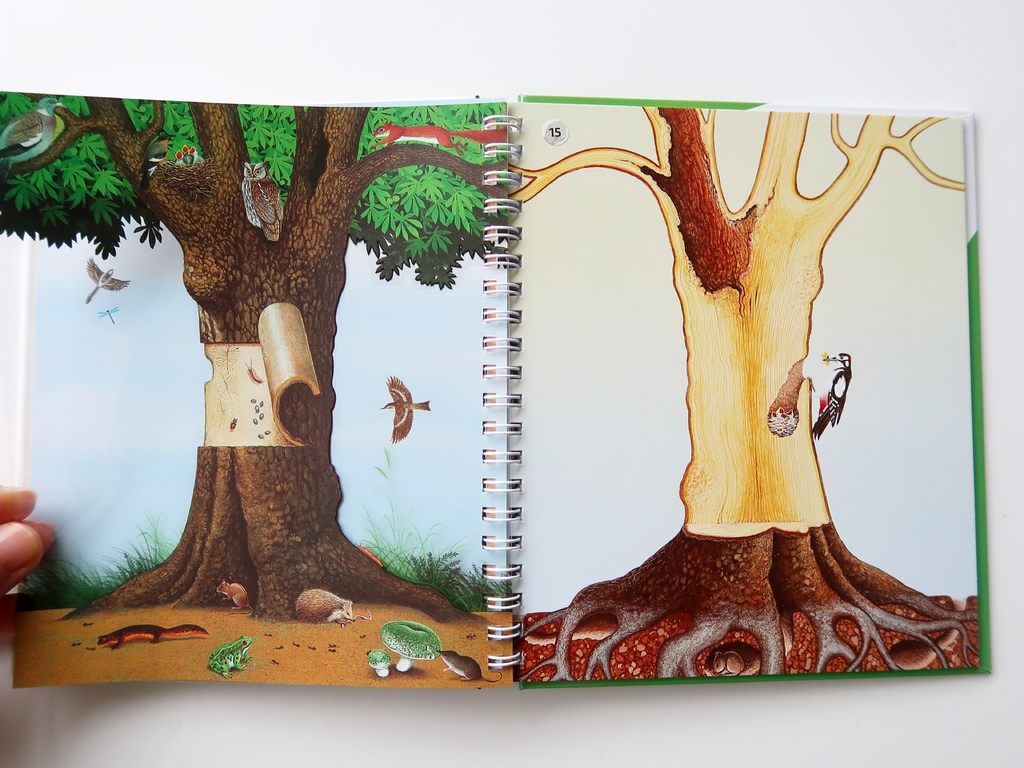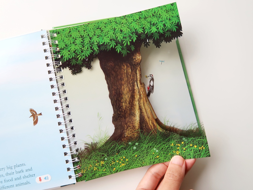 掀開雙面膠片一探究竟,原來樹枝上、樹幹裡、樹下、樹根都藏了好多小動物,包括貓頭鷹、鴿子、松鼠、鼴鼠、老鼠、青蛙、小蟲等。用點讀筆點擊動物,會發出不同的叫聲,並說出他們的英文名字。