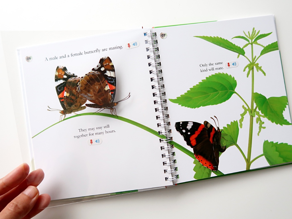公蝴蝶和母蝴蝶交配時,可以在一起好幾小時。將透明膠片翻頁,在書頁右方的蝴蝶,就會飛到左頁去找同種類的蝴蝶交配。這一頁的設計很有巧思。