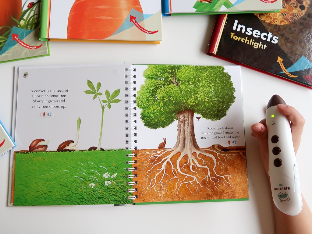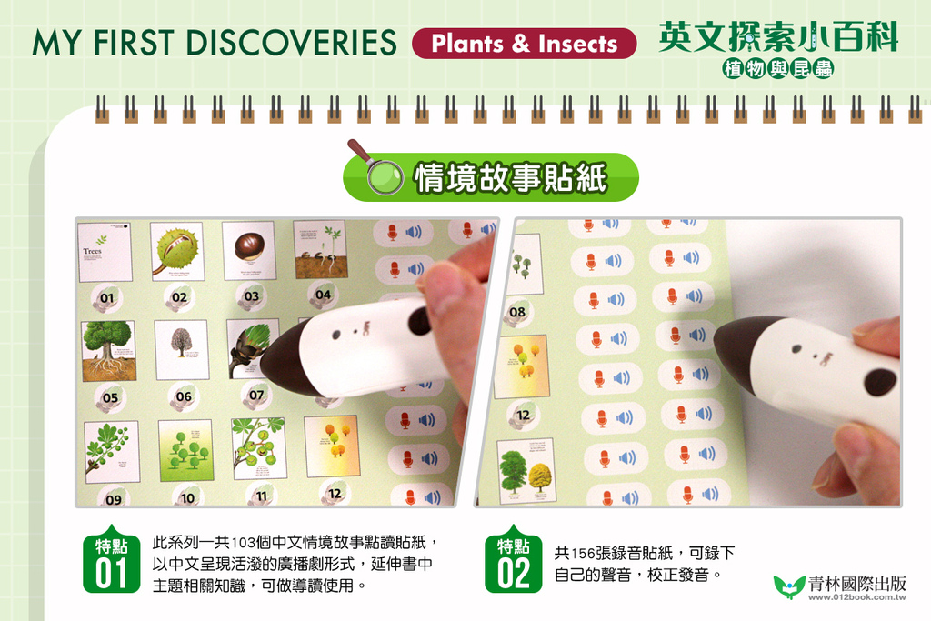 2021年5月,由青林出版社與KidsRead點讀筆合作發行的My First Discoveries 英文探索小百科第三輯 Plants & Insects 植物與昆蟲,內容包括六本科普主題膠片點讀書、六頁中文情境故事點讀貼紙與錄音點讀貼紙、一本學習手冊、一張隨身點讀小卡。套書不分售。(上圖的大合照忘了讓點讀小卡一起入鏡)