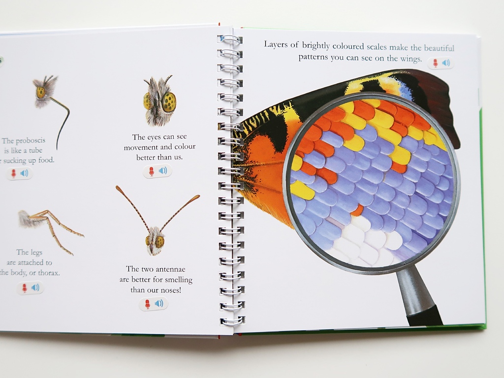 藉由局部放大特寫圖,深入說明蝴蝶口器、眼睛、腳、觸角、翅膀的功能和構造。