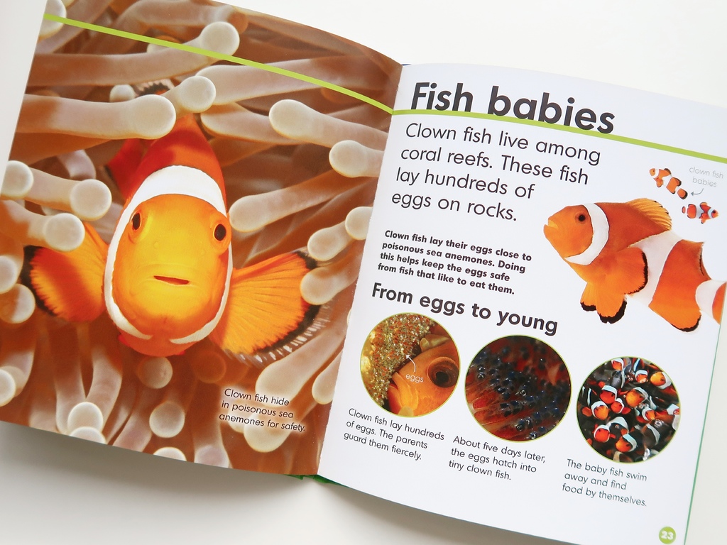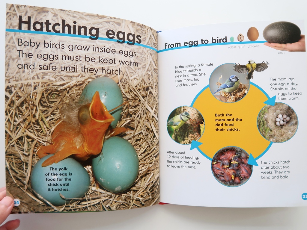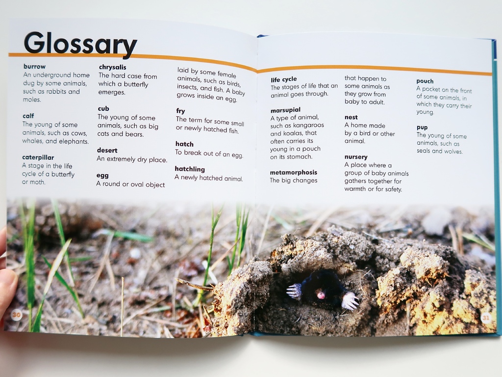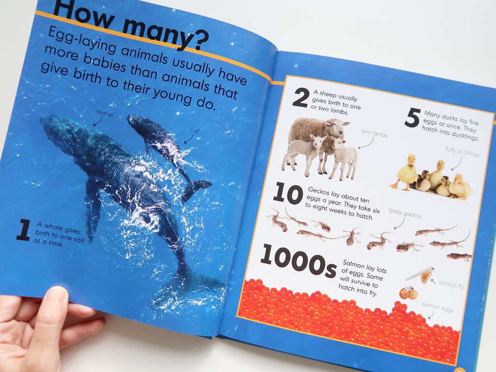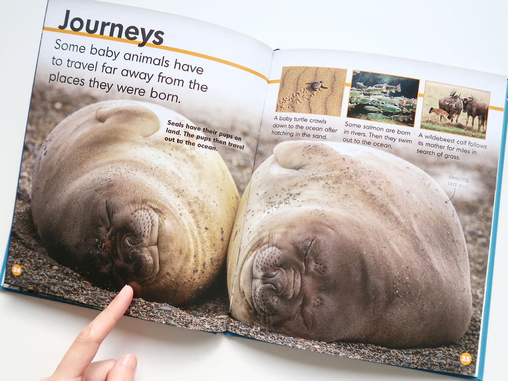 Animal Babies 這本書聚焦在「動物界的小寶貝」身上,收錄大量萌值爆表的新生動物圖片,最容易獲得小讀者的共鳴。這本書與See Me Grow 有不少內容相關,兩本搭配一起閱讀,學習效果更好。
