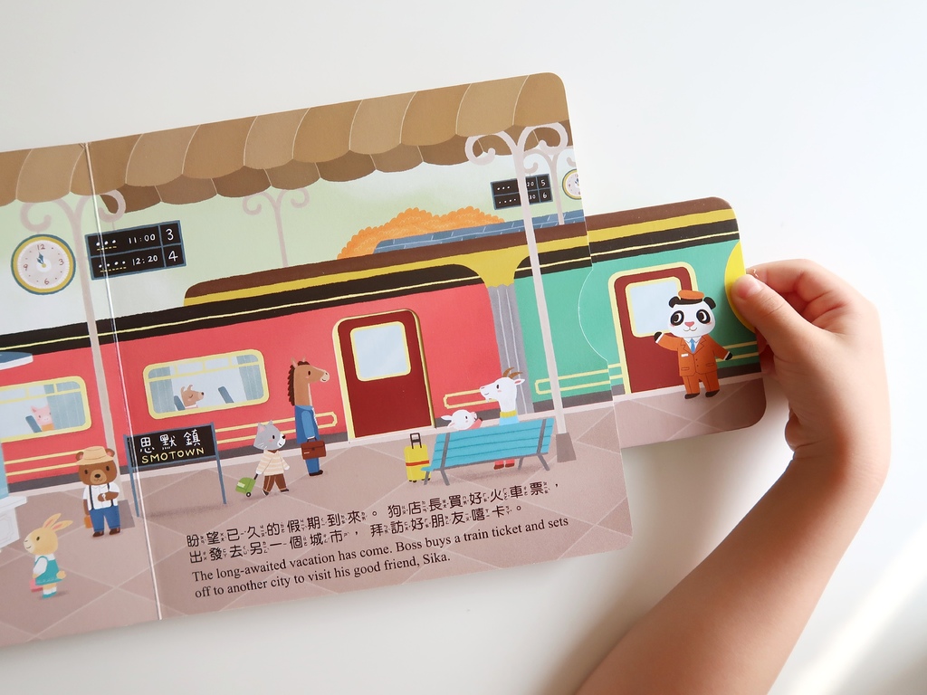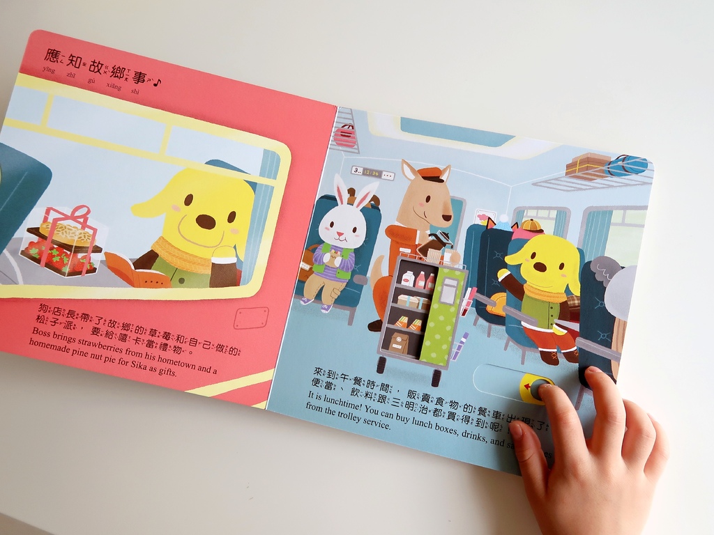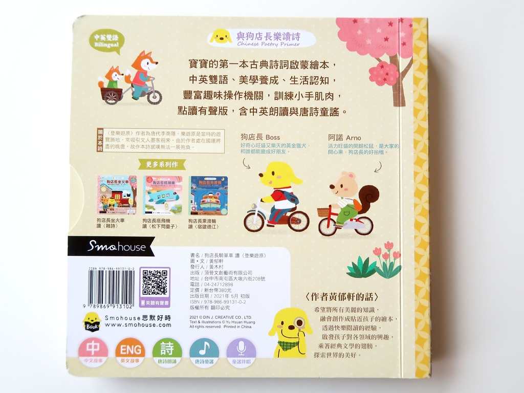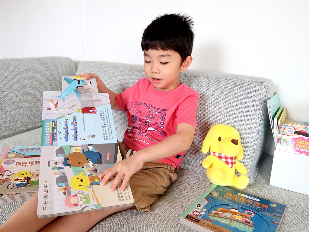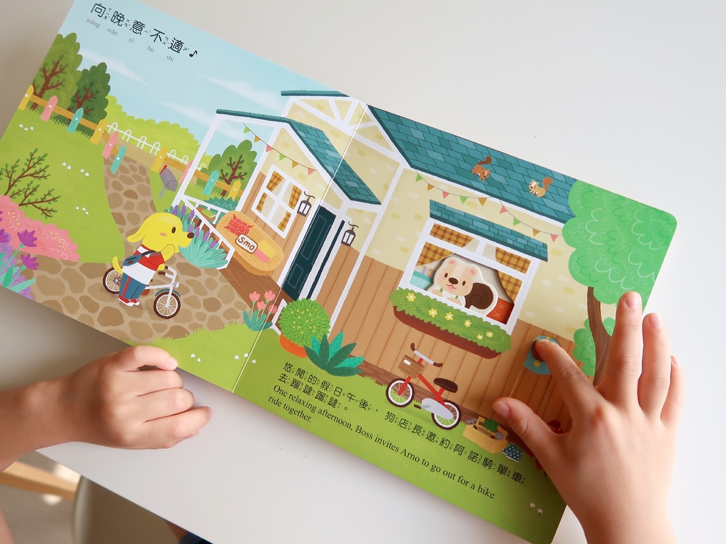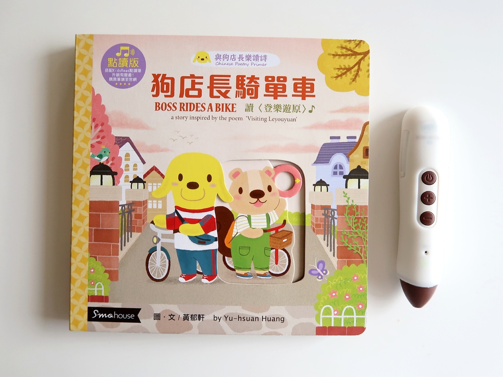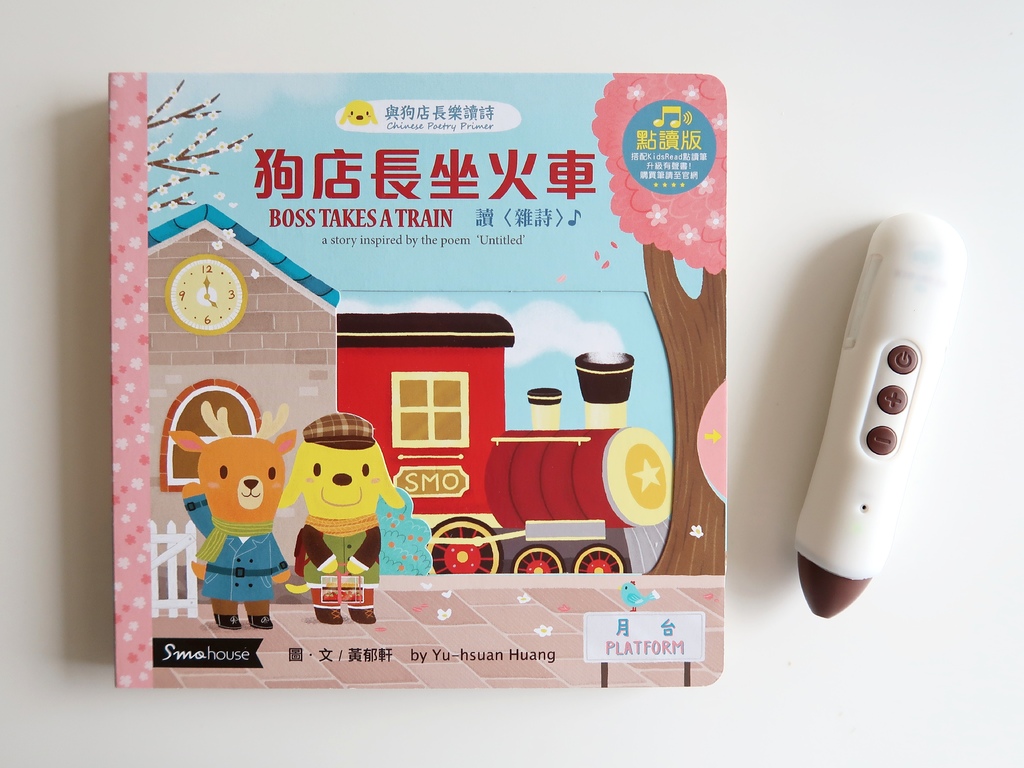 台灣插畫家黃郁軒自創品牌Smohouse旗下的「與狗店長樂讀書」系列,從2018年起與KidsRead點讀筆攜手合作,推出一系列中文點讀硬頁童書,有能訓練小手肌肉的推拉轉趣味操作機關、厚實耐操的硬頁、溫暖細膩的插圖、輕快悅耳的詩歌吟唱與情境故事,內文還是貪心媽媽最愛的中英雙語,N種享受一次滿足。
