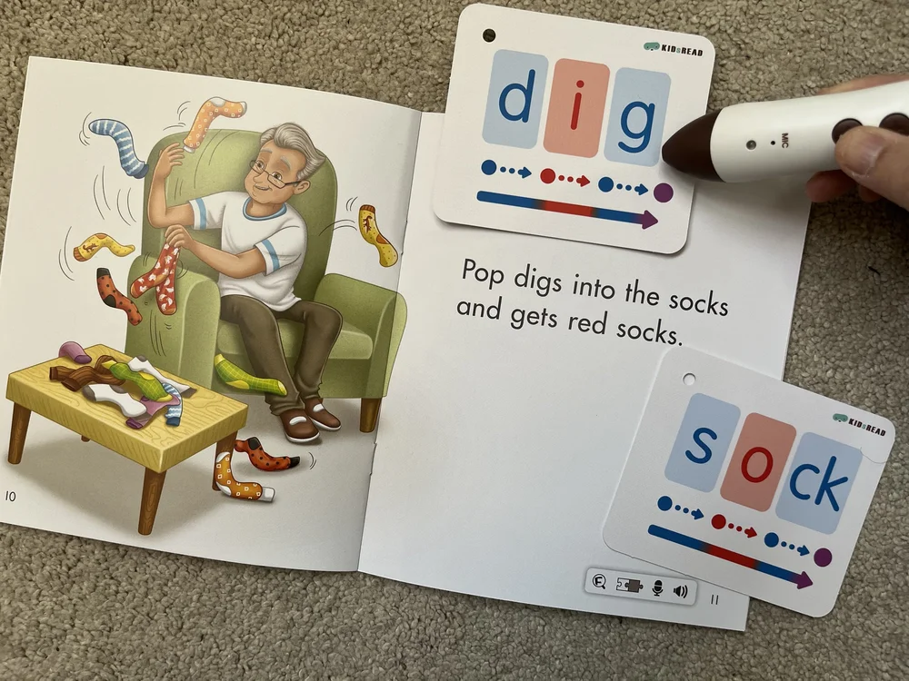 讀本中很棒的新點讀功能就是右下角長得像「拼圖🧩」的圖示,點擊後就會開啟CVC拼音模式。用這個模式點讀內文中的任何單字,都會變身成為CVC拼讀喔!