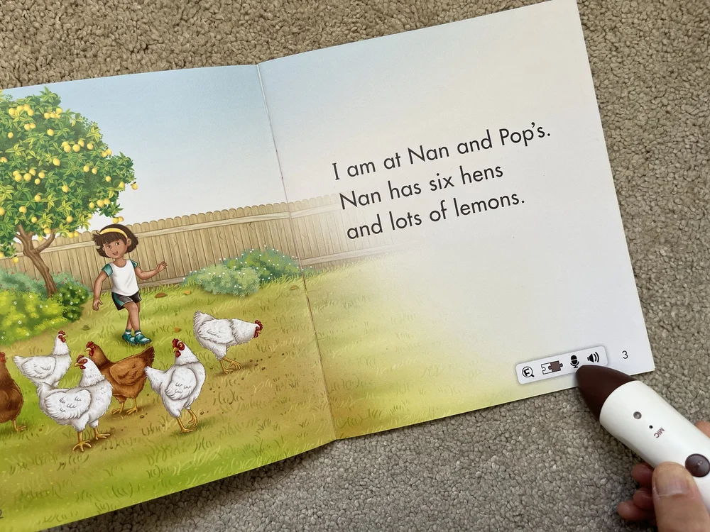 一般逐字點讀時,點一個單字會唸出一個字。而拼讀模式點單字,會先出現C —> V—> C的順序,接著立刻串字將整個單字完整發聲。例如點「hen」,點讀筆會說 h(發音)、e(發音)、n(發音),接著說「hen」(完整單字發音)。