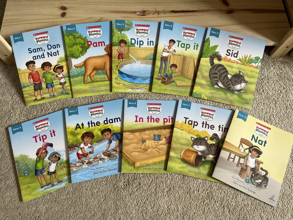 這是第一階段的10本繪本,由s > a > t > p > i > n > m > d八個音素拼讀組成: